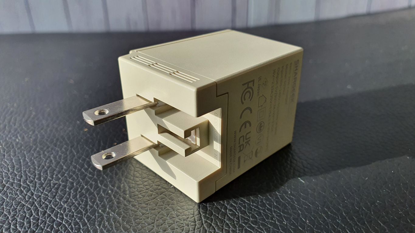 Shargeek Retro 35 GaN je relatívne kompaktná nabíjačka s rozmermi 4,3 x 3,5 x 3,2 cm. Vybavená je sklápacou vidlicou do amerických zásuviek, ktorá po vyklopení pridá k dĺžke 4,3 cm ďalšieho 1,5 centimetra. To je, bohužiaľ, prvá nevýhoda tohto zariadenia – ak ho chcete používať v našich zásuvkách, musíte mať adaptér.