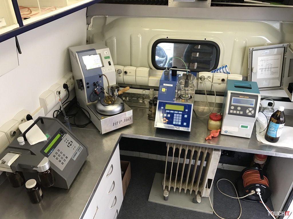 V pojazdnom laboratóriu sme videli niekoľko meracích prístrojov, prostredníctvom ktorých je realizovateľná detailná analýza normatívnych parametrov palív: