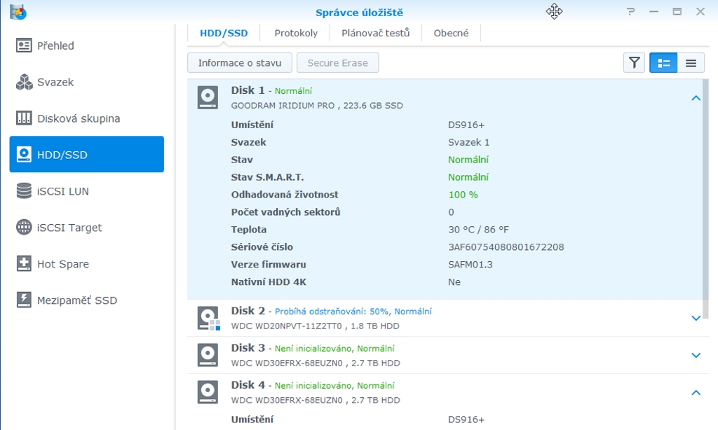 Tu je totiž možné vyskladať disky s maximálnou kapacitou 40 TB. To je niečo, čo vzhľadom na dnešné kapacity diskov poskytne rezervy. No, ak sa rozhodnete ísť ešte ďalej, dostanete sa na 90 TB. K modelu DS916+ sa dá pripojiť samotný rozširovač diskov, Synology DX513. Je to expanzná jednotka na päť diskov, ktorá sa k diskovej stanici pripája prostredníctvom e-Sata portu. Rovnako ako ostatné riešenia tejto značky v oblasti NAS, podporuje rôzne typy diskov. Použiť môžete SSD alebo HDD a to v oboch veľkostiach, teda 2,5 a 3,5″. Takto sme disky použili my v DS916+. Dvakrát WD Red vo veľkosti 3,5″ a jeden 240 GB SSD disk a do štvrtej šachty sme vložili HDD s kapacitou 2 TB a veľkosťou 2,5″. Šachty sú hot-swapové a disky môžete pridávať za chodu. Samozrejme, závisí to od spôsobu ich zapojenia. V správcovi diskov si vyberiete možné scenáre pripojenia do diskových polí. Je treba použiť rovnaké disky. Spôsobov pripojenia je niekoľko a konfigurácia umožňuje vybrať SSD disk ako cachovaciu jednotku. Dobrý nápad a ak by ste chceli na vašom NAS rozbehať nejakú multimediálnu stanicu alebo zálohovací server s kontinuálnym zálohovaním dát z PC, môže byť SSD ako „keška“ dobrý nápad.