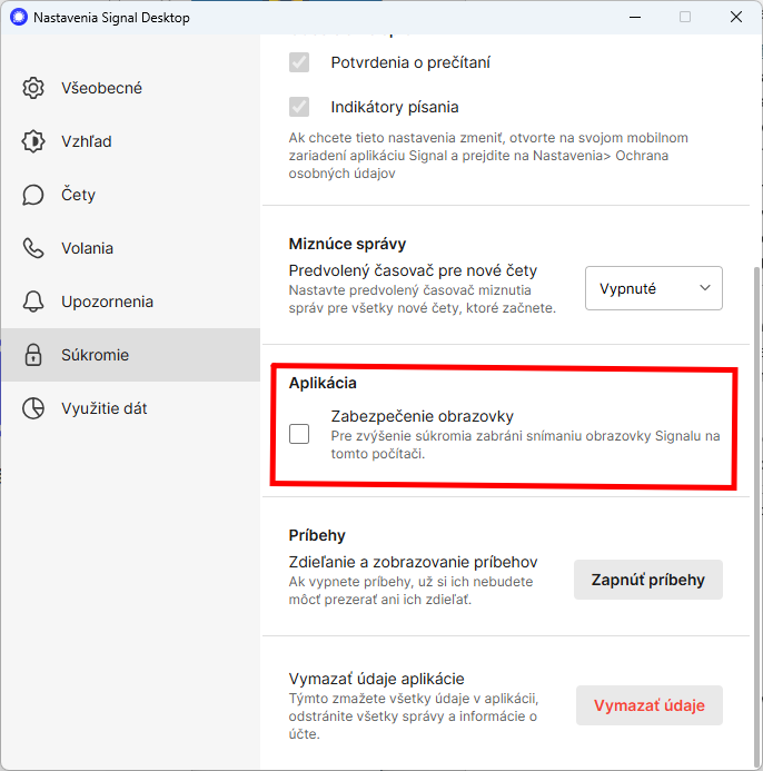 Signal už teraz obsahuje predvolene nastavené zabránenie snímkovaniu. Nájdete ho v nastaveniach s tým, že táto možnosť zakáže vytváranie robenia snímok akoukoľvek aplikáciou. To logický platí aj na tvorbu snímok obrazovky klasickou funkciou „print screen“ vo Windows. Môžete to vyskúšať a uvidíte, že okno Signalu bude zatmavené.