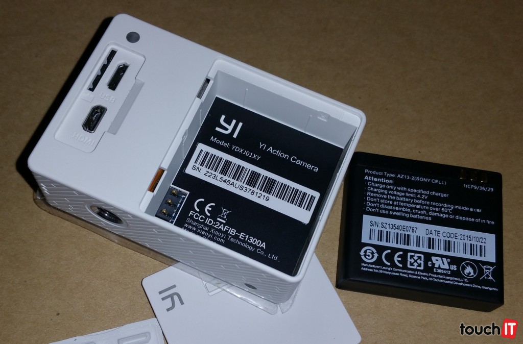 Kamera má pod krytkou v zadnej časti slot na microSD kartu do maximálnej kapacity 64GB (odporúča sa class 10) čo vystačí na cca 4 až 5 hod záznamu. Pod krytkou sa ešte nachádza microUSB port pre nabíjanie batérie a microHDMI port pre pohodlné prepojenie kamery napr. s TV a tak pozerať vytvorené videá a fotografie.