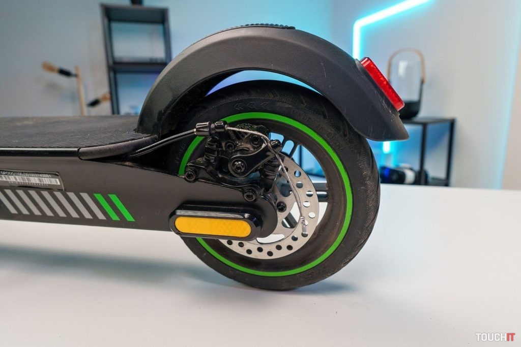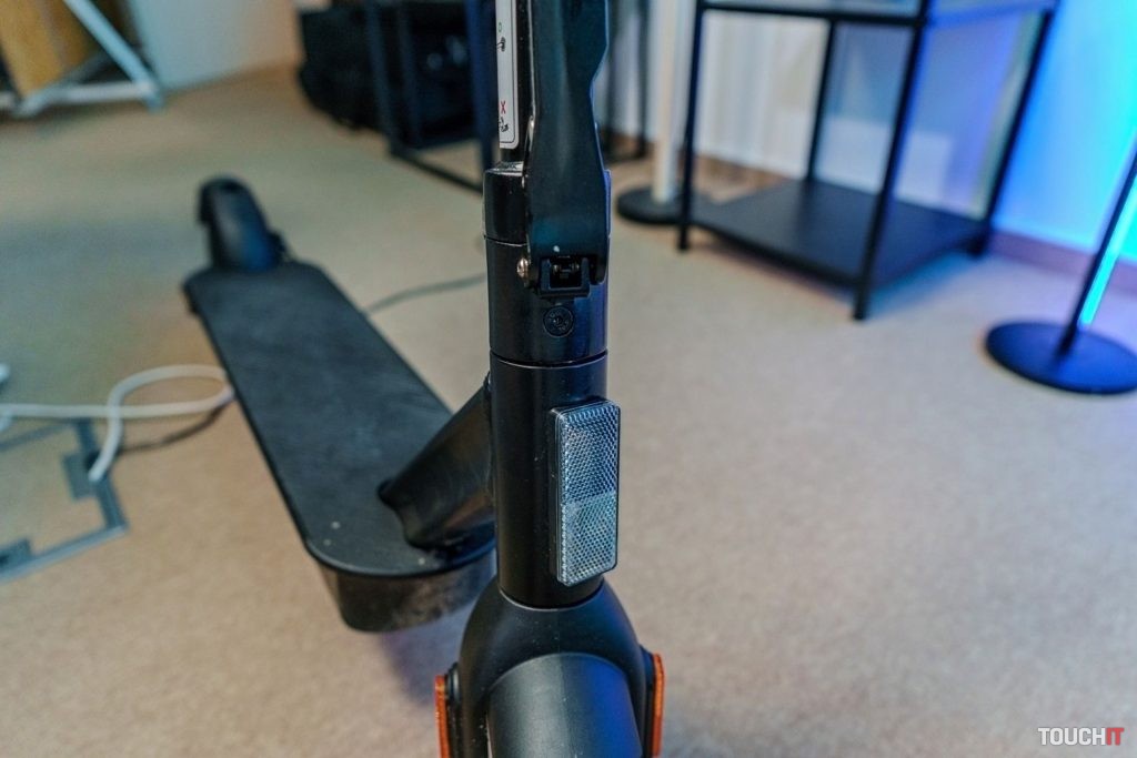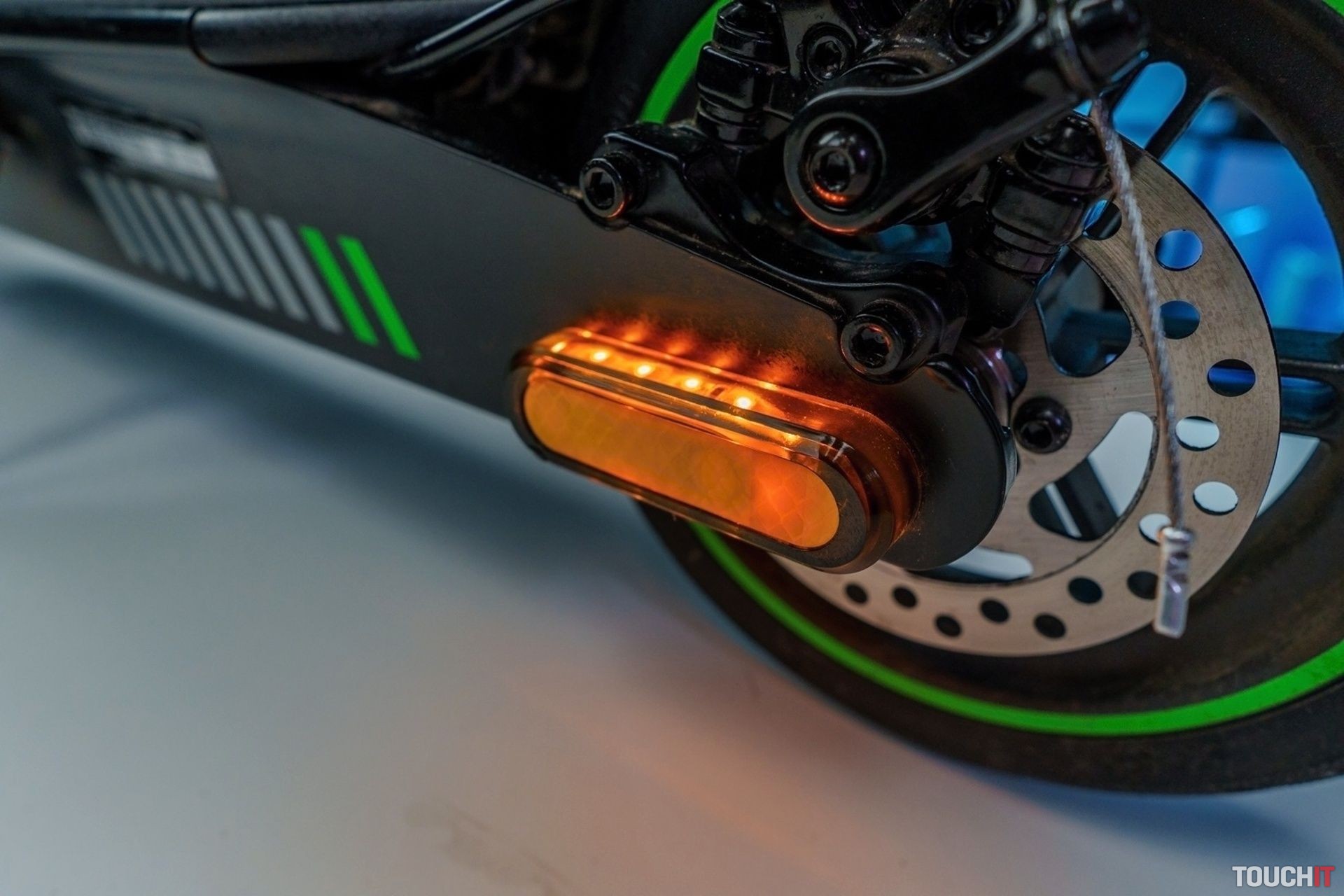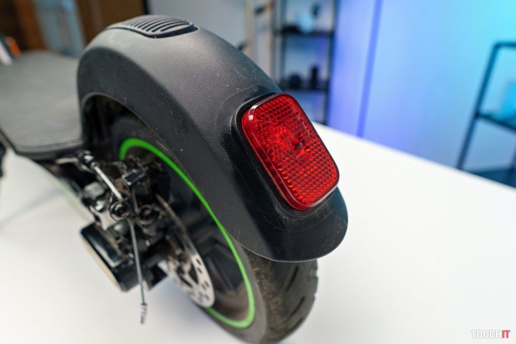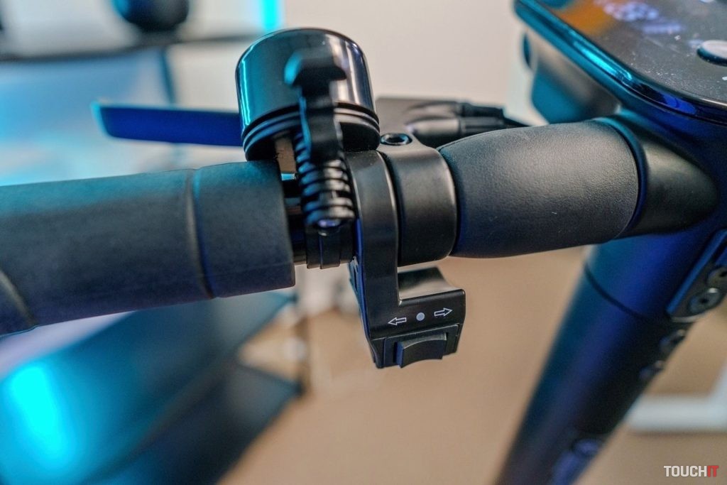 Súčasťou výbavy je aj prepínač pre smerovky, tie blikajú v okolí zadného kolesa. Overili sme si, že to vodiči jazdiaci za kolobežkou rešpektujú.