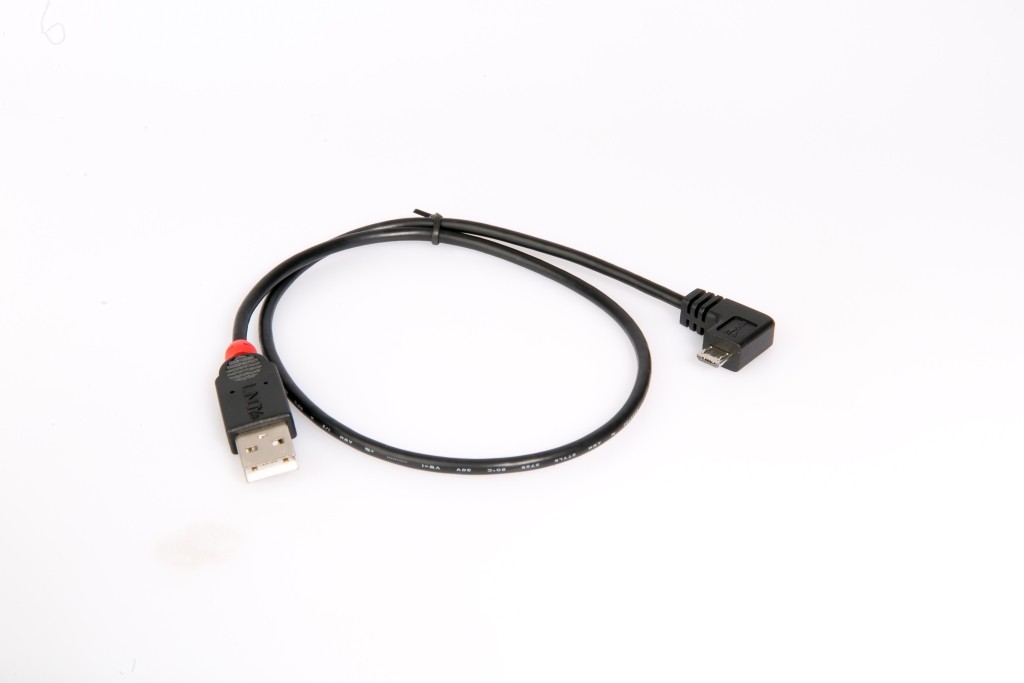 USB 2.0 kábel s koncovkou micro-B zahnutou o 90° sa vždy hodí. Výhodný je hlavne na mobilné zariadenia, ktoré majú nabíjací adaptér na boku, pričom tento kábel potom menej zavadzia. Po celej dĺžke je pogumovaný, prichytenie adaptérov je posilnené voči poškodeniu. Kábel existuje v rôznych dĺžkach. My sme mali 0,5-metrový, ale existuje aj 1 a 2-metrové vyhotovenie. Cena: 3,08 EUR