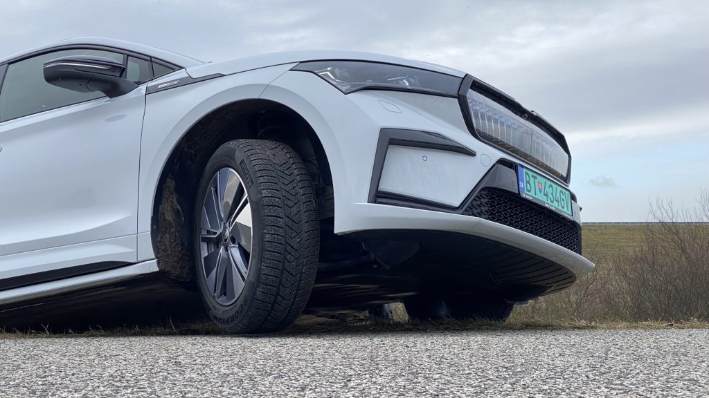 Enayq má dva elektromotory, predný a zadný, takže ide o „permanentnú 4kolku“, ktorú dopodrobna riadi elektronika podľa rôznych snímačov. Kríženie náprav a „off-road“ v rámci možností relatívne nízkeho podvozku som nemohol vynechať a s kľudom Angličana, teda Čecha pri dobrom točenom, môžem uviesť, že pohon všetkých kolies funguje prekvapivo výborne, či už na podmočenom teréne v strmom stúpaní alebo v rámci kríženia náprav, kde Enyaq iV 80X veľmi rýchlo vyhodnotil situáciu a pohol sa vpred bez extra váhania.