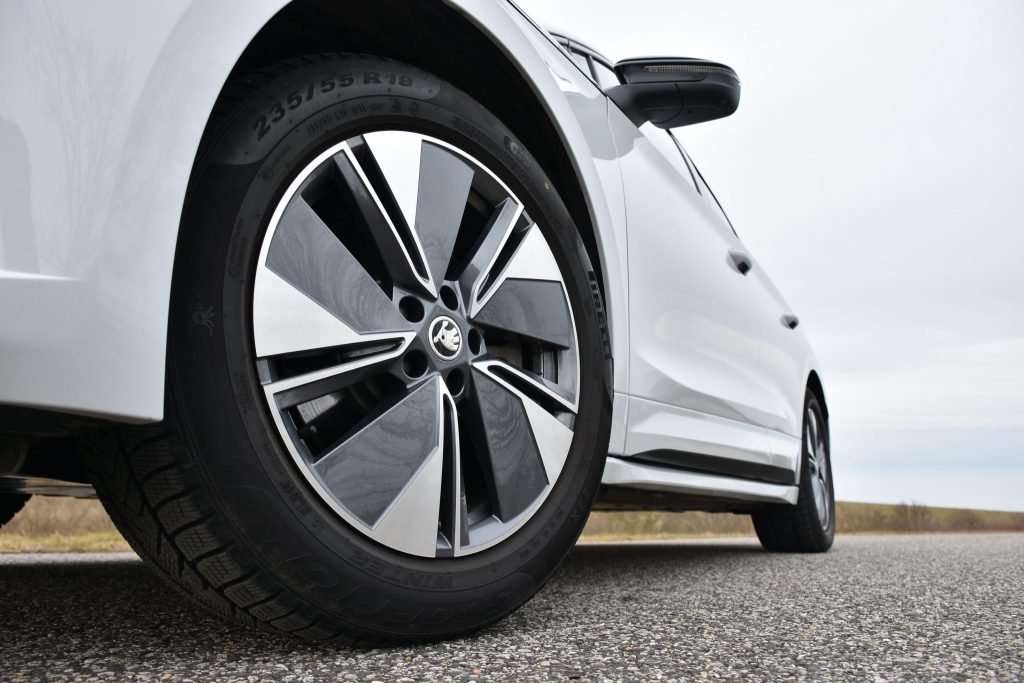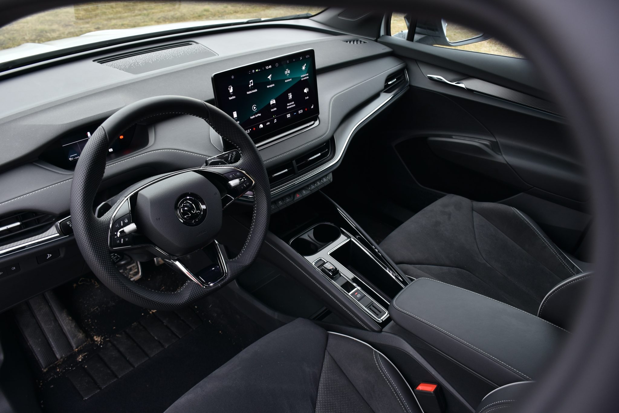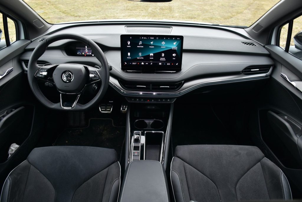 Nezostanem však iba pri výkone ako takom, lebo okrem toho musí za niečo stáť aj podvozok, ktorý je vo verzii 80X SPORT LINE adaptívny, takže sa mení tuhosť tlmičov a nastavenie elektroniky, čo v praxi reálne cítiť. Najviac citeľnou zmenou je, pochopiteľne, prechod z režimu ECO do režimu SPORT. Podvozok stuhne, rovnako tak riadenie a každé pohladkanie akcelerátora je znateľné s okamžitým prejavom, a to chceme! Je to škoda a škoda musí fungovať dobre, čo potvrdzujem, pričom nie som vôbec žiadny eko-terorista a stále mi viac vonia benzín a nafta ako „elektrické výboje“. Ešte by som rám dodal, že Enayq iV 80X je vo všeobecnosti trošku tvrdšie naladený. Komfort je síce na vysokej úrovni, ale niekto citlivejší to môže vnímať intenzívnejšie.