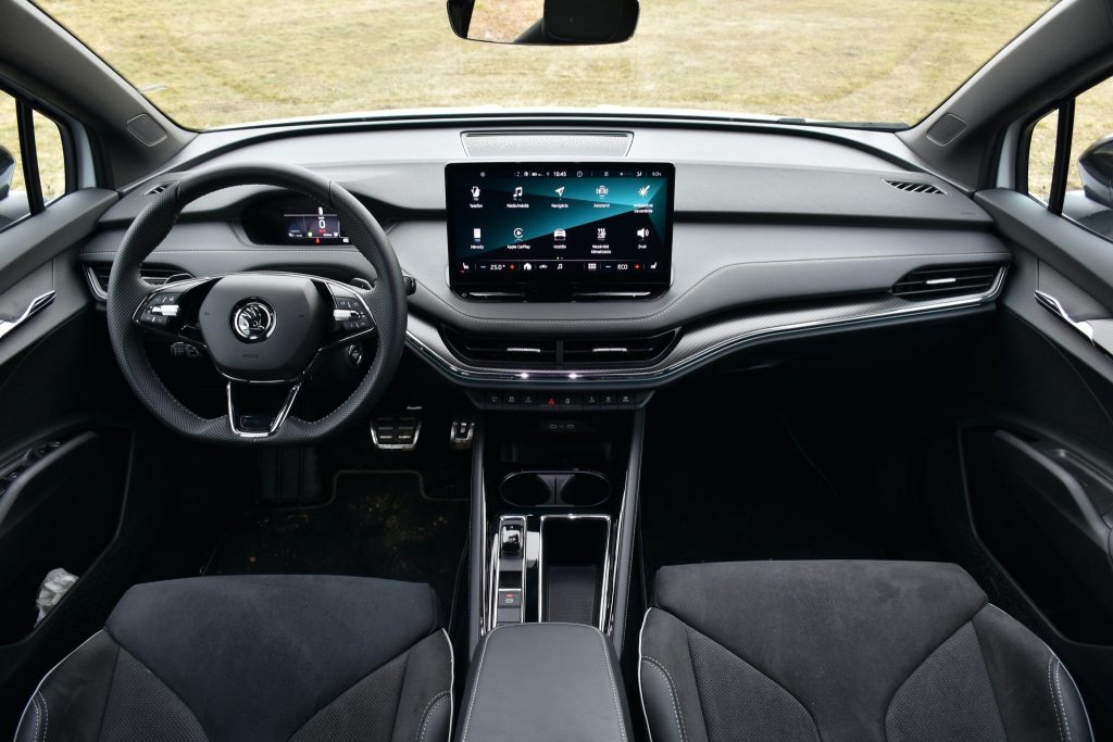 Konektivita? Plná! Tu skutočne netreba premýšľať nad tým, čo chýba, lebo nechýba asi nič, v ponuke je všetko od Bluetooth, cez Wi-Fi (aj so zdieľaním pre pasažierov), prehľadnú mobilnú aplikáciu so vzdialeným ovládaním klimatizácie a nabíjania až po 4 USB-C porty. Aha, takže predsa len niečo bude treba, redukciu! Ak máte káble iba s USB-A konektorom, tak tu nepochodíte a budete musieť navštíviť nejaké elektro alebo toho otravného zeleného mimozemšťana a kúpiť redukciu z USB-C na USB-A. A viete čo je ešte super? To, že Enyaq ponúka podporu Apple CarPlay a Android Auto bez nutnosti použitia káblov, plne bezdrôtovo, k čomu sa hodí aj priestor na bezdrôtové nabíjanie telefónu. Vo výsledku by ste teda žiadny kábel nepotrebovali, ale istota je istota, však?! To je ako s vyhrievaným volantom, načo mi to bude, ale keď prituhne, tak kancelárske ručičky tento mini luxus ocenia, rovnako ako vyhrievané sedadlá, dokonca aj vzadu.