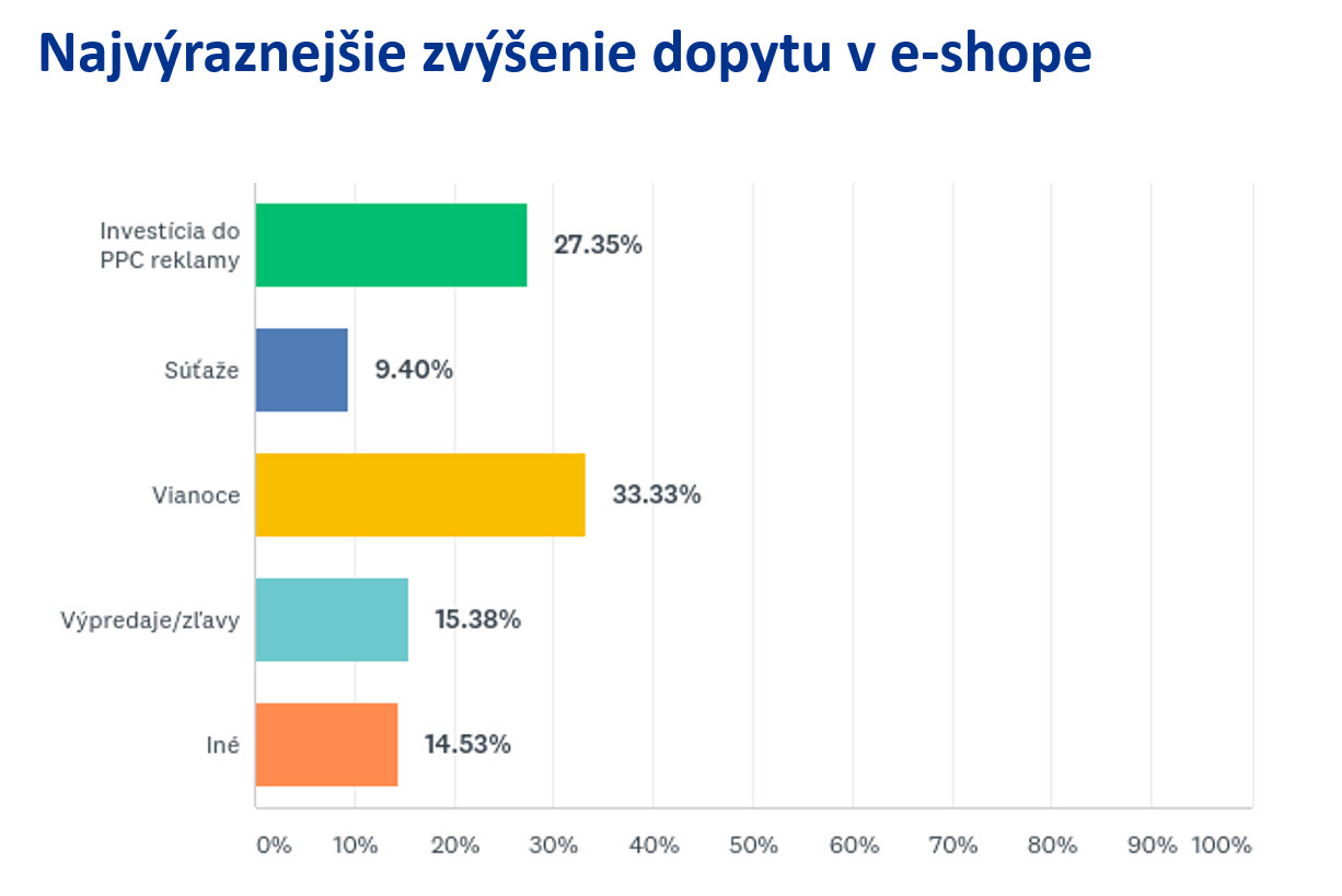 Vianočné sviatky sú považované prevádzkovateľmi e-shopov za top faktor zvýšenia predaja. Vyjadrila sa tak tretina opýtaných. Na druhom mieste sa umiestnila tzv. PPC reklama, teda online reklama, kde zadávateľ platí za klik na stránku promujúcej spoločnosti.