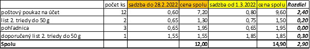 Ak mesačne zaplatíte jednu najbežnejšie používanú zloženku (teda 12 ročne), za rok podáte dva listy druhej triedy do 50 g („obyčajný“ list), ročne pošlete tri pohľadnice a jeden doporučený list 2. triedy do 50 g, po 1. marci 2022 za rok zaplatíte o 2,90 € viac ako minulý rok.