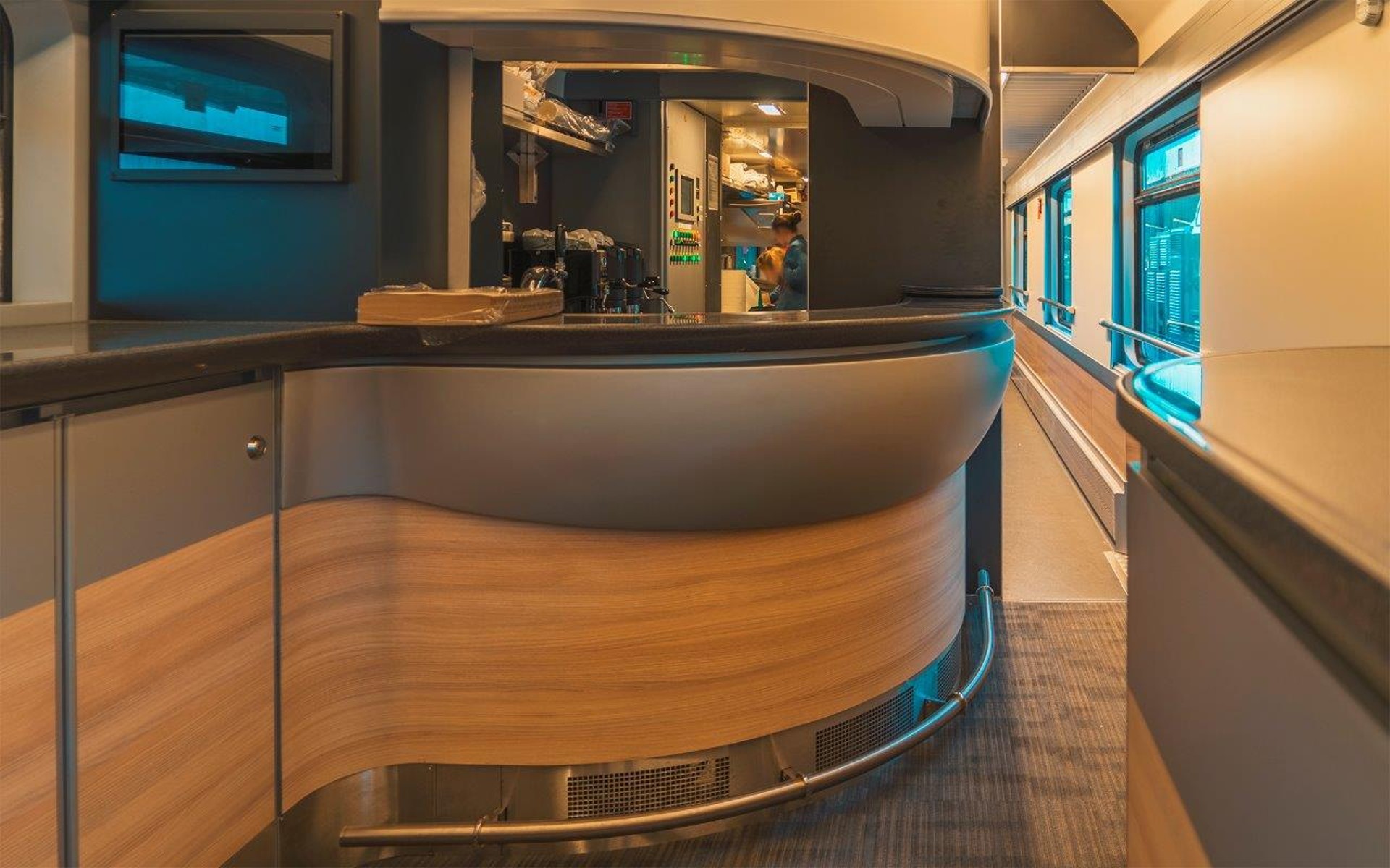 - vnútorný priestor vozňa (mimo nástupného priestoru a WC) je členený na priestor pre cestujúcich, bar a kuchyňu
