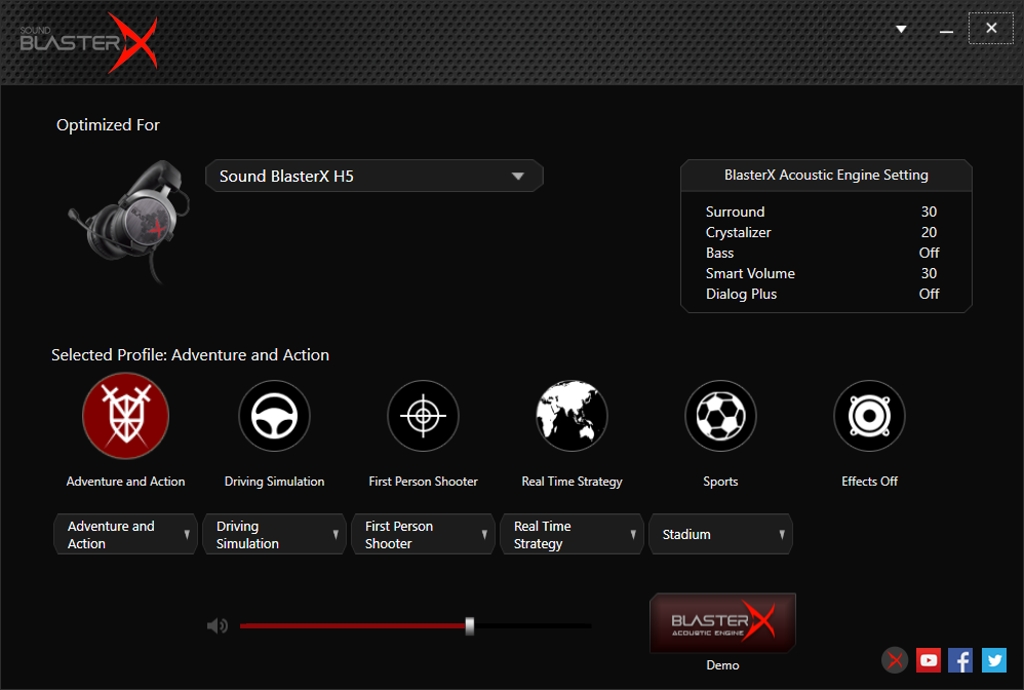 Toto je špecializovaný softvér na nastavenie zvuku, avšak zvuku pre hráčov. Hudbu budete musieť doladiť cez ekvalizér prehrávača. Acoustic Engine Lite je zadarmo, treba sa len zaregistrovať. Potom si stačí vybrať slúchadlá, aby systém vedel lepšie vyladiť zvukový profil. V našom prípade sme vybrali model H5, keďže špecializovaná verzia Tournament Edition ešte nebola dostupná. Na výber je päť profilov zatriedených podľa všeobecných žánrov hier. K nim máte možnosť špeciálneho výberu podporovaných hier. Nie je ich tu veľa, ale po zvolení Metal Gear Solid namiesto všeobecného profilu Adventure and Action zistíte rozdiel. Softvér ukazuje nastavenia pre každý profil. Presne viete, v akej hladine intenzity sú priestorové efekty, basy, Smart Volume alebo Crystalizer na obnovu stratených tónov zvukovou kompresiou.