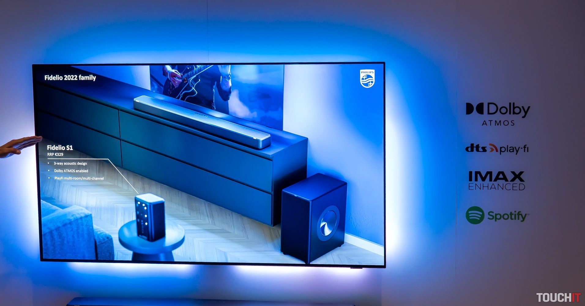 Reproduktory FS1 v kompaktnej skrinke kombinujú 1-palcový výškový reproduktor, zhora namontovaný 2,5-palcový uhlový reproduktor, 3,5-palcový basový reproduktor s dvoma pasívnymi žiaričmi a osvetlenie LED pre zabudovaný Ambilight.