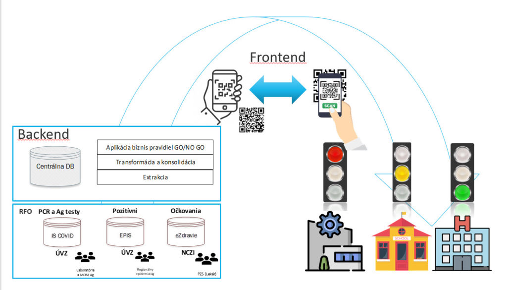Pre verejnosť viditeľná časť systému (Frontend) je aplikácia pre mobilné telefóny všetkých typov. Vytvorený QR kód sa pri čerpaní služby alebo pri návšteve podniku skenuje pomocou jednoduchej čítačky alebo aj iným smartfónom. Na túto prednú časť riešenia nadväzuje hlavná časť – backend, ktorý obsahuje centrálnu databázu vytvorenú z databáz dotknutých zložiek: Ústavu verejného zdravotníctva a Národného centra zdravotníckych informácií.