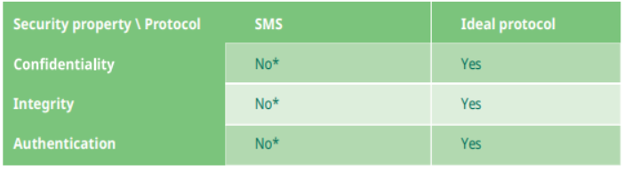 Bezpečnostná firma Dekra pripravila porovnanie SMS verzus ideálny protokol. V tabuľke, ako je uvedené nižšie, sa porovnávajú tri základné vlastnosti. V prvom rade si kladie otázku, či sa dá veriť, že nikto iný nemôže čítať danú správu. Druhý riadok sa sústreďuje na obsah správy. Môžeme si byť istí, že správa počas prenosu nebola upravená?
