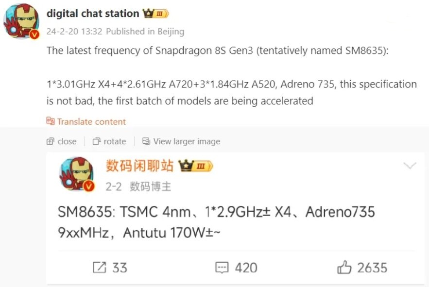 Taktovacie frekvencie tak potvrdzujú, že Snapdragon 8s Gen 3 nie je výkonnejší ako Snapdragon 8 Gen 3. Tie sú však aj v zhode s označením tejto čipovej sady SM8635 vs. SM8650 čipovej sady 8 Gen 3. To isté platí aj v prípade GPU Adreno 735 vs. Adreno 750.