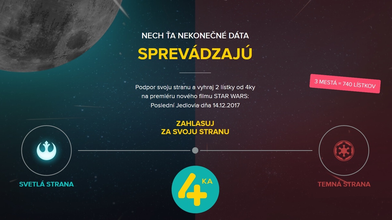 Samotná súťaž bude prebiehať ako boj svetlej a temnej strany sily v reálnom čase, ktorý bude naživo znázornený pomocou súboja svetelných mečov na webe 4ka.sk. Na zapojenie sa do súťaže stačí zahlasovať online na www.4ka.sk/starwars-sutaz za svetlú alebo temnú stranu sily. Vyhráva tá strana sily, ktorá bude na konci hlasovania silnejšia. Teda všetci, ktorí zahlasovali za víťaznú stranu, budú zaradení do žrebovania o lístky, ktoré sa uskutoční 7. decembra 2017. Pri hlasovaní si môžete vybrať, v ktorom meste chcete film vidieť – či už v Bratislave, Banskej Bystrici alebo v Košiciach. Každý vyžrebovaný výherca získa 2 vstupenky na večerné premietanie Star Wars: Poslední Jediovia, v deň jeho svetovej premiéry 14. decembra o 20:40 hod.