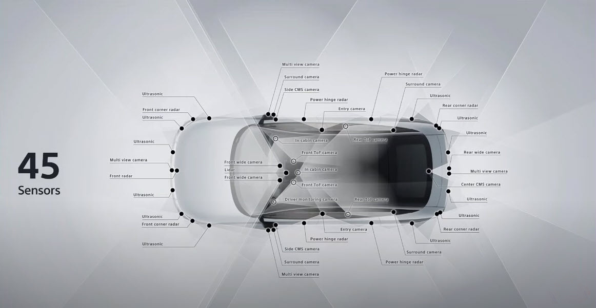 Čo teda vlastne dodáva Sony, keďže po stránke základu automobilu to bude Honda? Od Sony pochádza celý zábavný systém určený pre spolujazdca ale hlavne pre cestujúcich vzadu. Ďalej je to senzorická výbava, prototyp Afeela má celkov 45 snímačov (vrátane kamier) vo vnútri ale hlavne zvonka elektromobilu.