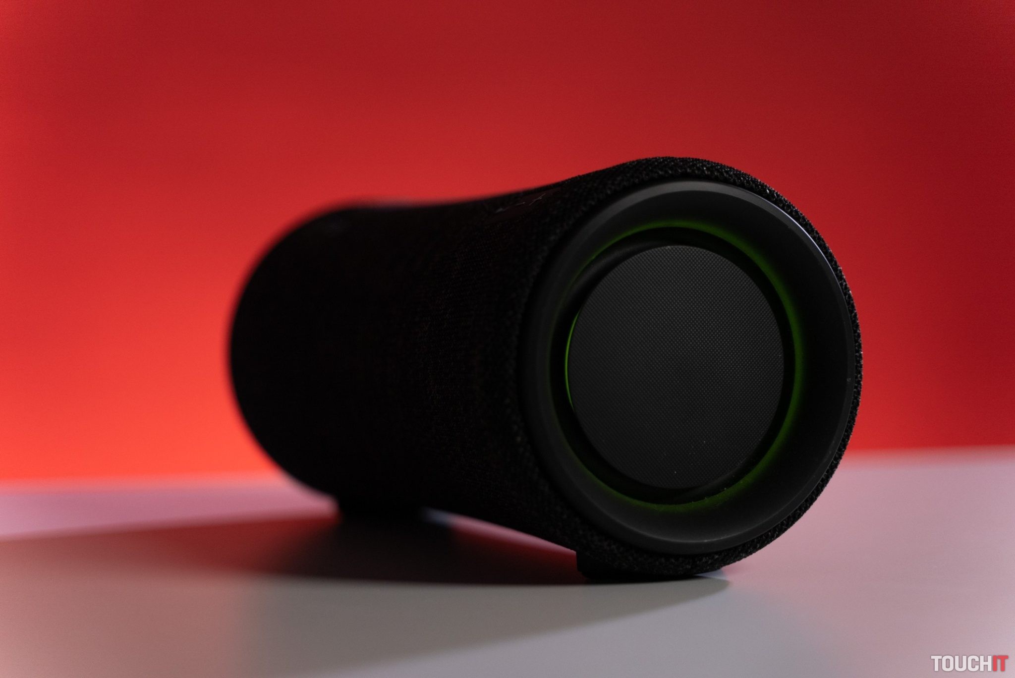 Silné nízke tóny vedia z týchto gumových plôch vyfŕkať vodu. Prakticky z jednej, keďže takto by ste mali reproduktor postavený na výšku. Okolo nich sú výrezy na prenikanie LED svetelných efektov. Tie sa zapínajú tlačidlom na zadnej strane, pohodlnejšie to bude cez aplikáciu. Oceňujem ale to, že nepotrebujete na všetko aplikáciu. Ľudia aj bez aplikácie môžu zmeniť typ a farebnosť svetelného efektu aj bez toho, aby na to potrebovali váš smartfón.