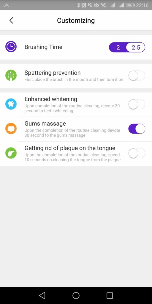 V aplikácii si môžete prispôsobiť čistiaci režim tak, aby čo najviac vyhovoval vašim potrebám. Čas čistenia je možné predĺžiť až na 2,5 minúty. Zvoliť si môžete ochranu pred špliechaním, aby sa kmitanie oddialilo o niekoľko sekúnd, kým si zubnú kefku so zubnou pastou dáte do úst a zároveň, aby sa po programe klasického čistenia spustilo na záver či už 30 sekúnd bieliaceho režimu, masáže ďasien alebo 10 sekúnd režimu čistenia jazyka.