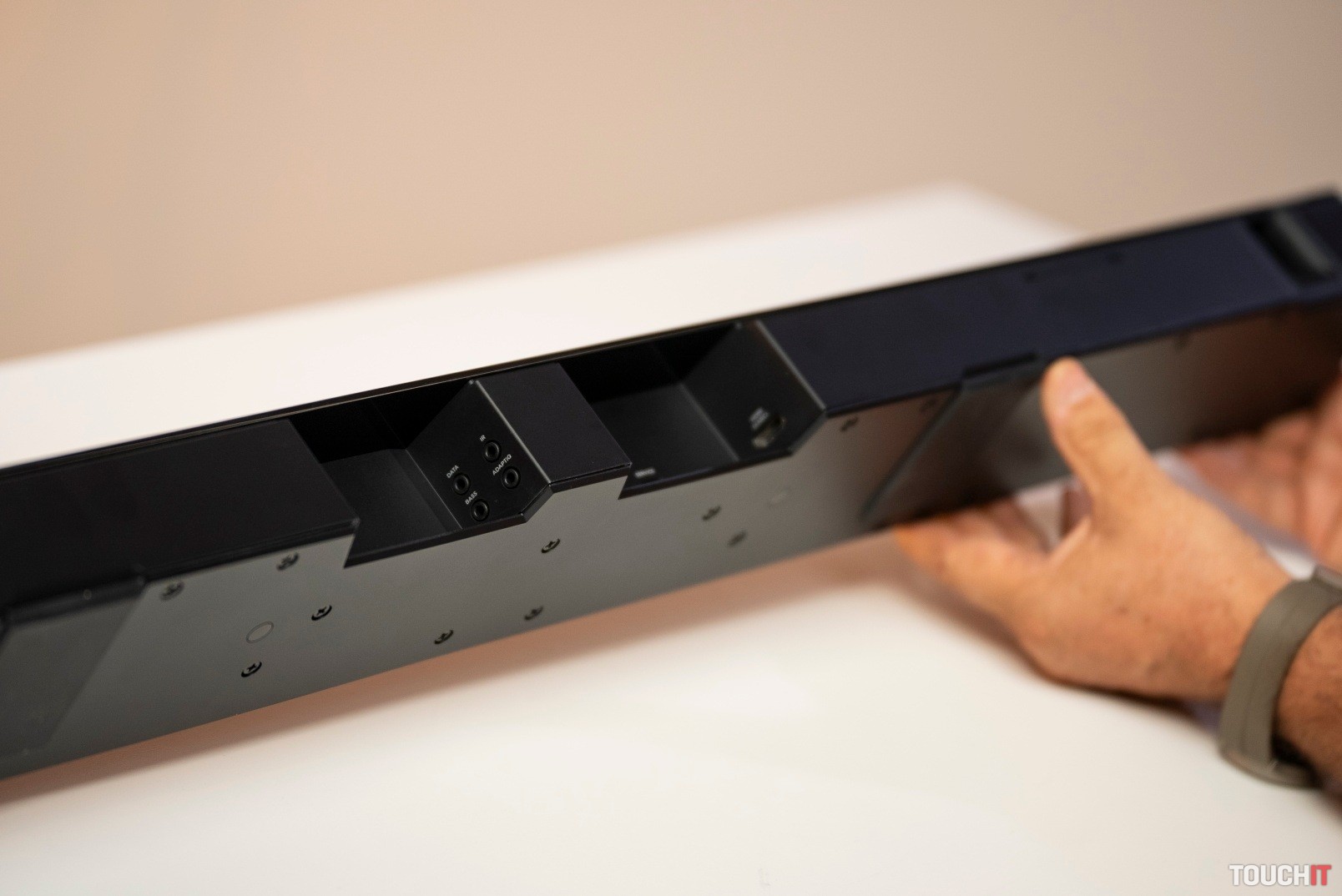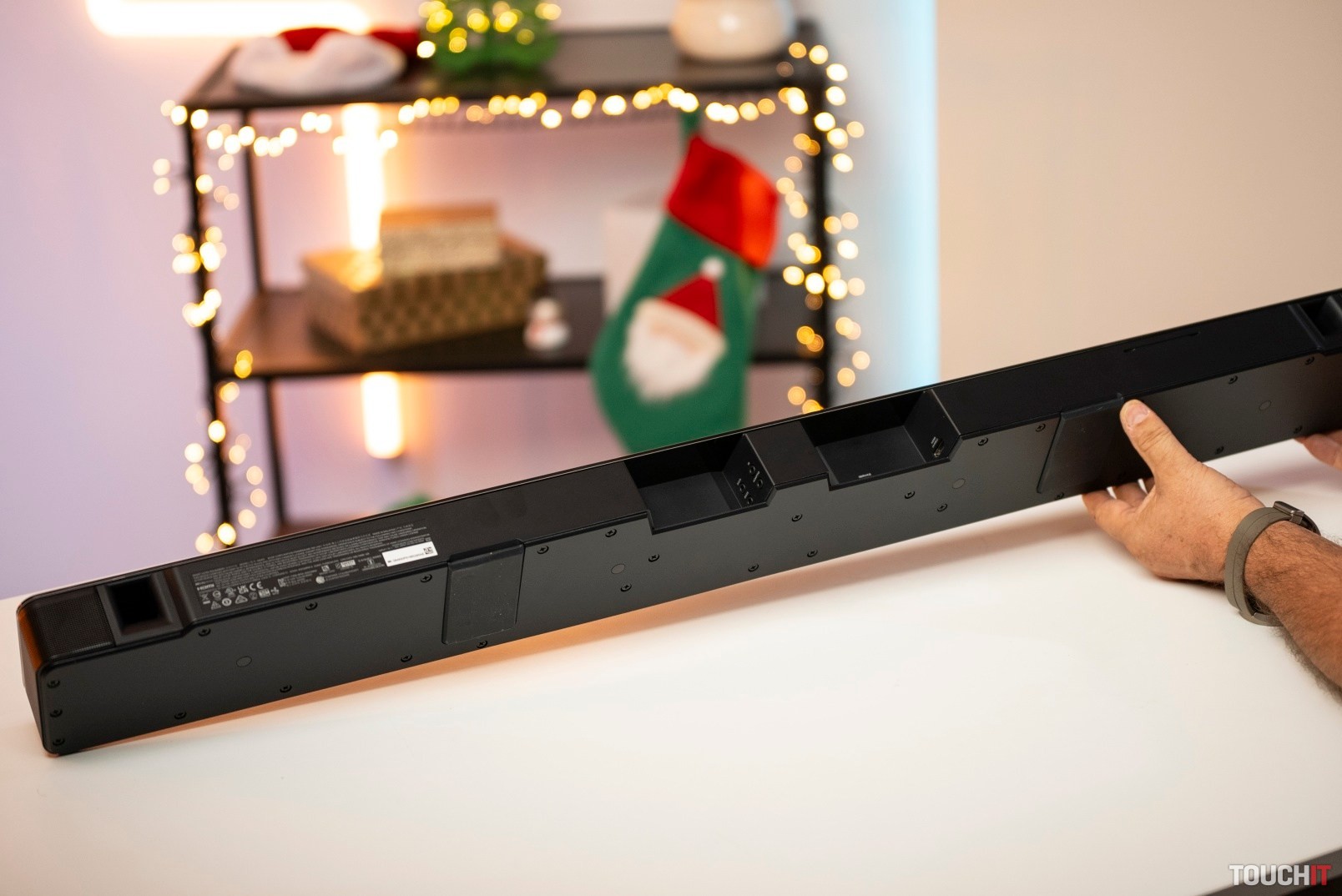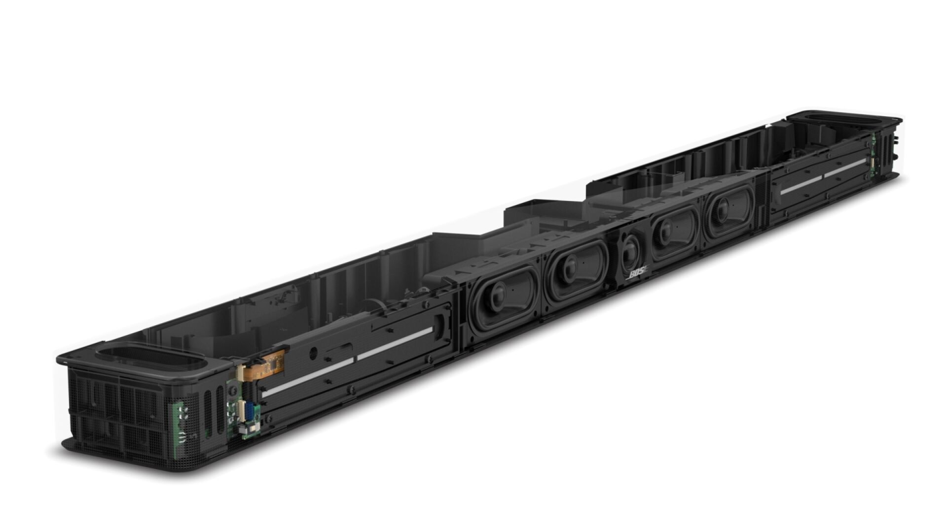 Bose Smart Ultra je práve takýmto soundbarom. Jeho základom je zvukový systém Dolby Atmos 5.1.2 so 7 reproduktormi a zabudovaným subwooferom. Ide teda o päť reproduktorov, ktoré zabezpečujú tradičný priestorový zvuk. Začnime stredovým reproduktorom, potom sú tu dva predné a dva zadné efektové kanály. Tie sú zabudované celkom na boku zariadenia a využívajú špeciálne úzkosmerové meniče. Reproduktor uprostred funguje ako subwoofer, ale je priamo zabudovaný do tela soundbaru. Posledná 2 v označení formátu súpravy predstavuje dva reproduktory smerujúce z tela soundbaru do stropu.