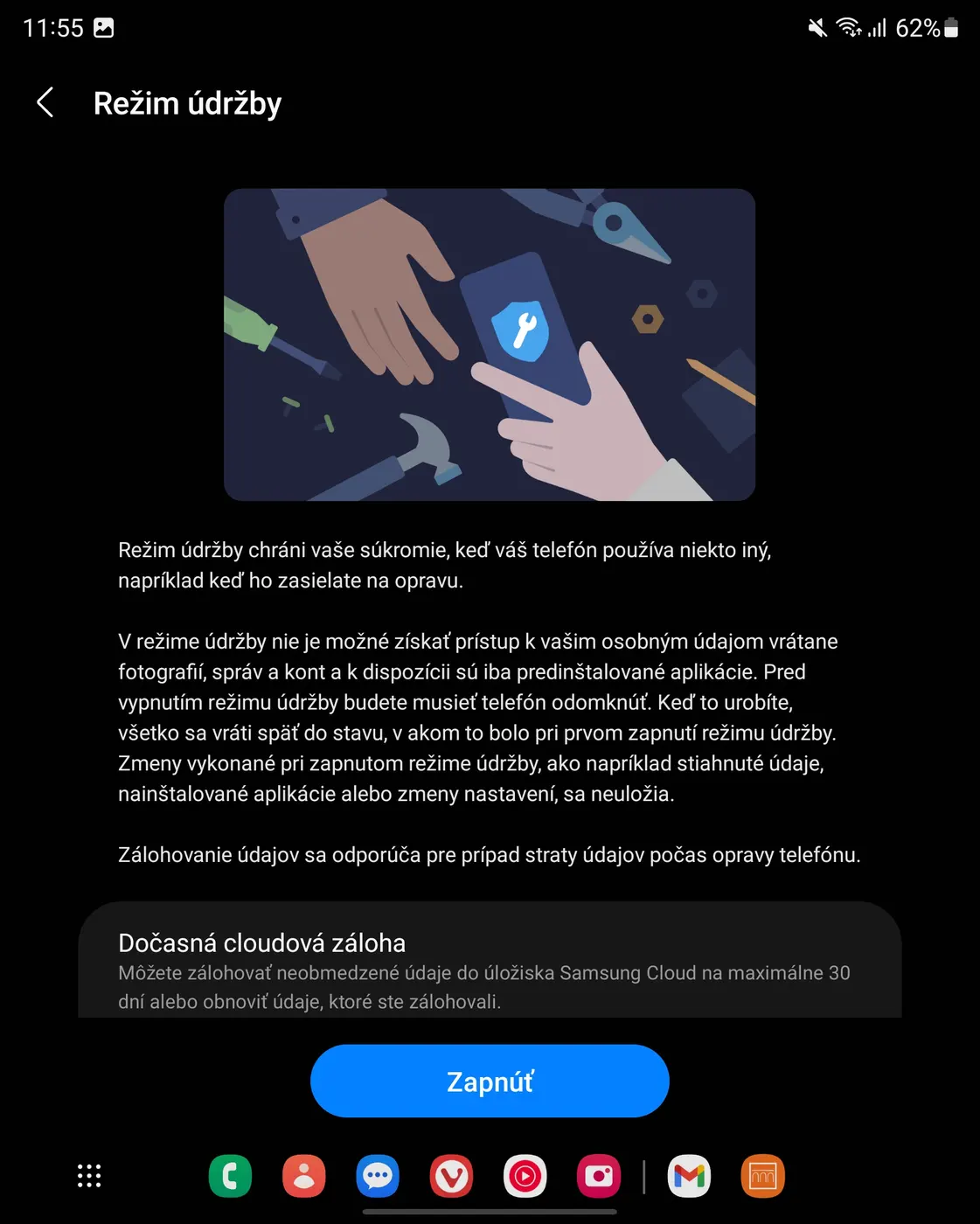 - Samsung – Niektoré modely podporujú režim údržby, ktorý obmedzuje prístup k osobným údajom a súkromným aplikáciám.