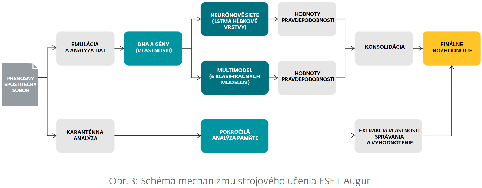 Na analýzu používa vlastný algoritmus nazvaný ESET Augur, ktorý sa má postarať o to, aby boli vzorky kategorizované správne. Tu je dôležité, aby analýza neskôr nespôsobila nepresnosti v triedení hrozieb. Ak sa na seba začnú podobať a dostávať sa k pomyselnej hranici „bezpečné“, neskôr by mohli byť nesprávne triedené nebezpečné vzorky. Boli by totiž tak blízko zóny s bezpečnými až by splynuli.