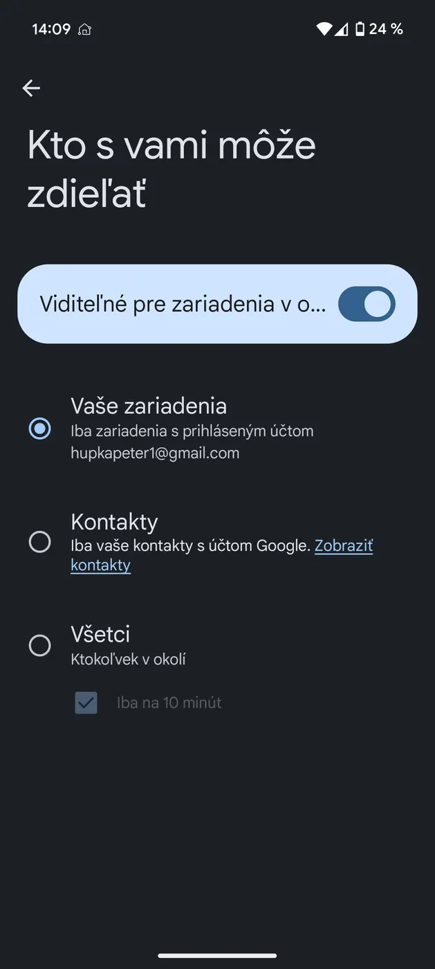 Priamo v nastaveniach aplikácie Files je možné nastaviť, “kto s vami môže zdieľať” súbory. Vybrať si môžete z troch možností – vaše zariadenia, vaše kontakty a všetci. Pri tretej možnosti môžete viditeľnosť vášho zariadenia obmedziť na 10 minút.