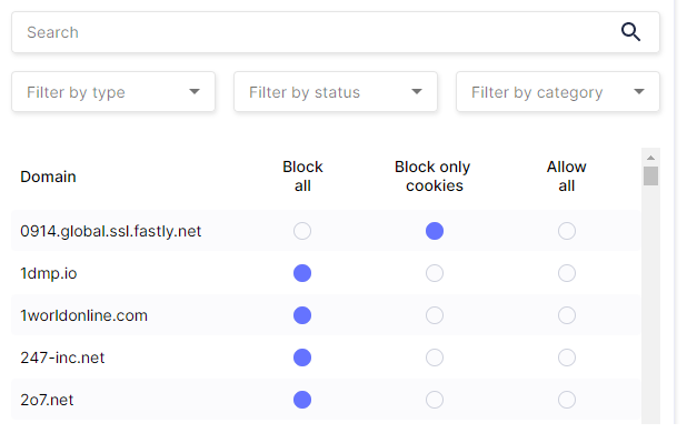 Špecialitou tohto doplnku je zoznam tzv. trackerov. Toto je práve úzke hrdlo medzi vaším súkromím. Máte na výber medzi všeobecným povolením týchto stopovacích skriptov a prvkov. Nemusíte to robiť na základe webu ale na základe prvku. Všetky sú zoradené v zozname, kde sa zároveň definuje jeho povolenie, zablokovanie alebo povolenie len na účely uloženia cookies.