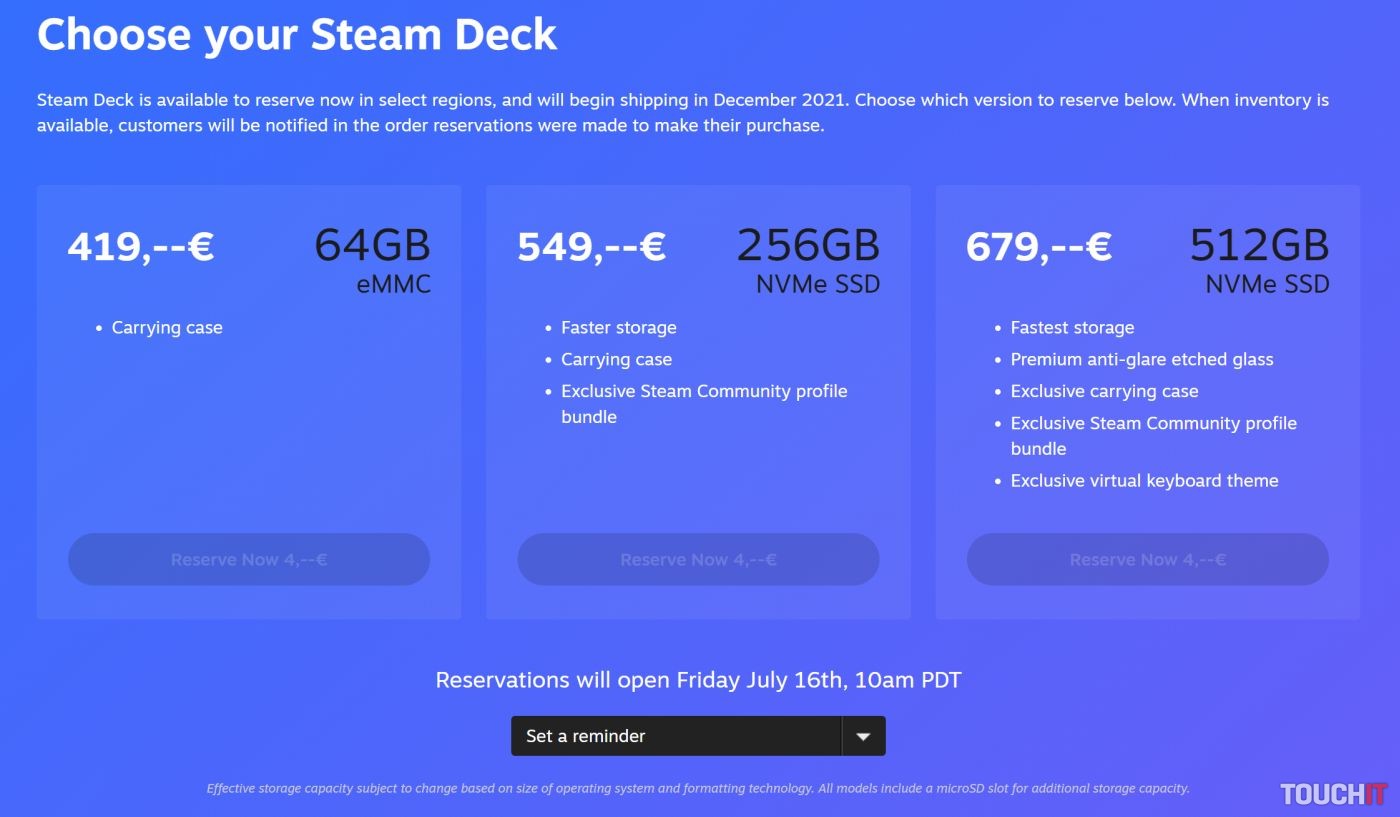 Steam Deck sa dostane na trh v decembri a k dispozícii bude v troch konfiguráciách, ktoré sa odlišujú veľkosťou a typom úložiska a takisto aj matným sklom na displeji v prípade najvyššej konfigurácie. Valve uvedie na trh aj dokovaciu stanicu, ktorá uľahčí pripojenie zariadenia k externému displeju.
