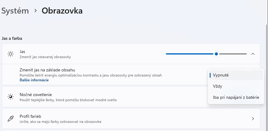 Toto sa dá od Windows 24H2 odstrániť priamo z menu Nastavenia – Obrazovky. Doteraz sa do dalo buď vypnúť v BIOSe (minimum počítačov) alebo cez ovládač grafickej karty Intel. V uvedenej sekcii, ako je to vidno na obrázku vyberte niektorú z troch možností. Môžete si ponechať nastavenie, ako doteraz, číže pri práci v režime na batérie alebo upravovať jas vždy a nakoniec vítaná možnosť toto celé vypnúť.