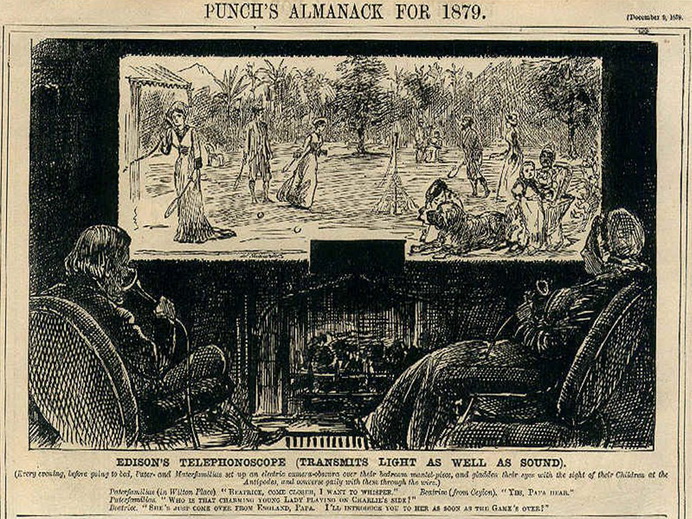 Jedným z prvých obrázkov, ktorý naznačoval takúto budúcnosť, pochádza od Georgea du Mauriera. Bol publikovaný v roku 1879 v britskom magazíne Punch, pričom ukazoval fiktívny vynález nazvaný telefónoskop, ktorý prenášal „zvuk aj svetlo“. Obrázok znázorňuje manželov, ktorí sa pozerajú vo svojom dome na veľkú elektronickú cameru obscuru (v tej dobe televízia ešte neexistovala) zhruba s dvojmetrovým obrazom a sledujú svoje deti na opačnom konci sveta ako hrajú tenis, pričom s nimi zároveň telefonujú. Na obrázku je popis: