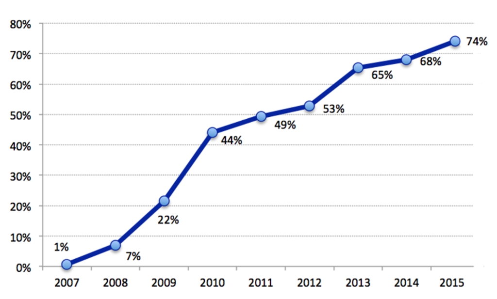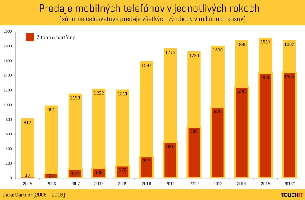 Predaje mobilných telefónov v jednotlivých rokoch (v miliónoch kusov). Kompletný rok 2016 je odhadnutý podľa výsledkov z prvých troch kvartálov