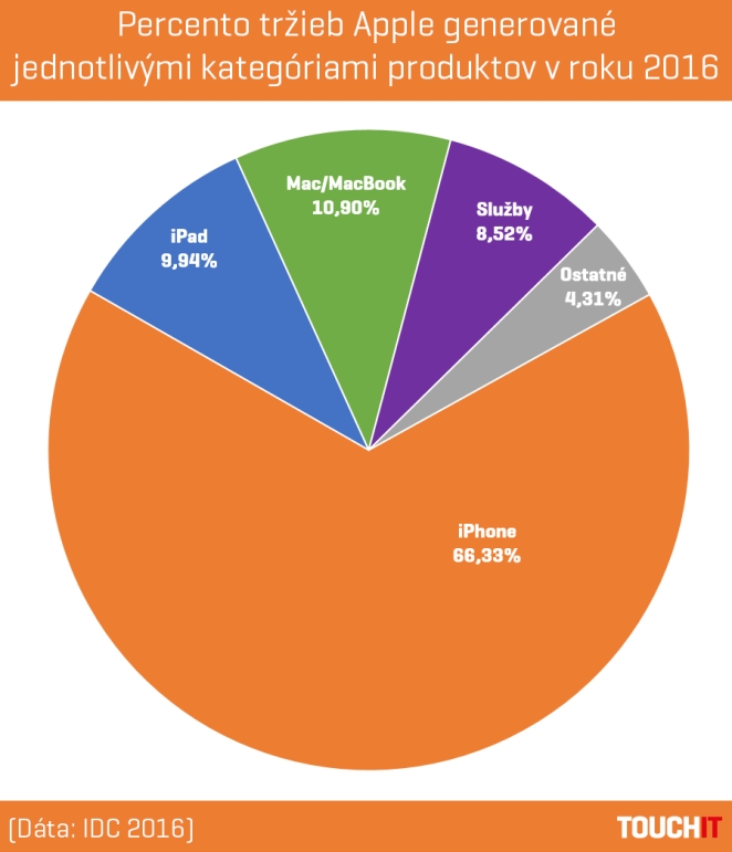 Diverzifikácia tržieb Apple podľa jednotlivých produktov v roku 2016
