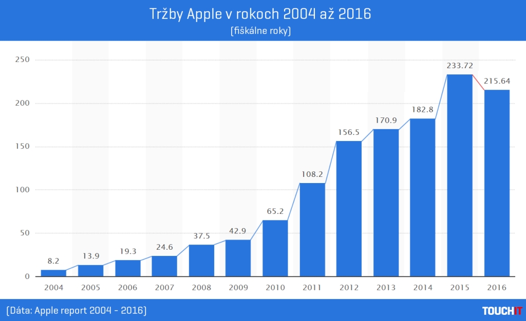 Po smrti Steva Jobsa v roku 2011 sa vedenia Apple ujal Tim Cook. Podobne ako v prípade prvého odchodu Jobsa v 80. rokoch, firma pokračovala v raste, ťažiac z úspechu, ku ktorému ju rozhodnutia Jobsa roztlačili. Vrchol však nastal v roku 2015. Vo fiškálnom roku 2016 (ktorý v prípade Apple končí na konci septembra), boli tržby prvýkrát po 14 rokoch menšie, konkrétne o 7,7 %. Možno si poviete, že na tom predsa nezáleží. Donekonečna sa rásť nedá a pokles z 233,7 miliardy dolárov na 215,6 je smiešny, keďže žiadna konkurencia sa k takýmto hodnotám ani len nepriblížila. Nie je to však také jednoduché. Nepríjemný je predovšetkým negatívny trend, jeho príčina a takisto miesto kde pôsobí. Pozrime sa na všetky tri tieto prvky.