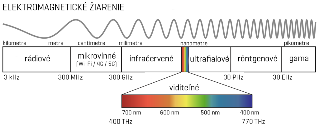 Ak oponujete tým, že tieto žiarenia zas až tak často nepoužívame, tak vedzte, že ľudstvo je na tom ešte omnoho „horšie“, pretože dlhodobo používa žiarenie s vlnami v rozpätí 700 nanometrov až po 400 nanometrov, čo sú frekvencie 430 až 770 teraherzov. V tomto masívnom elektromagnetickom žiarení neprestajne žijeme a vidíme ho na vlastné oči. Ide totiž o elektromagnetické žiarenie z našich displejov, lámp a samotného Slnka. Voláme ho viditeľné svetlo a variácie v rozpätí 430 až 770 teraherzov vidíme ako červenú až fialovú farbu.