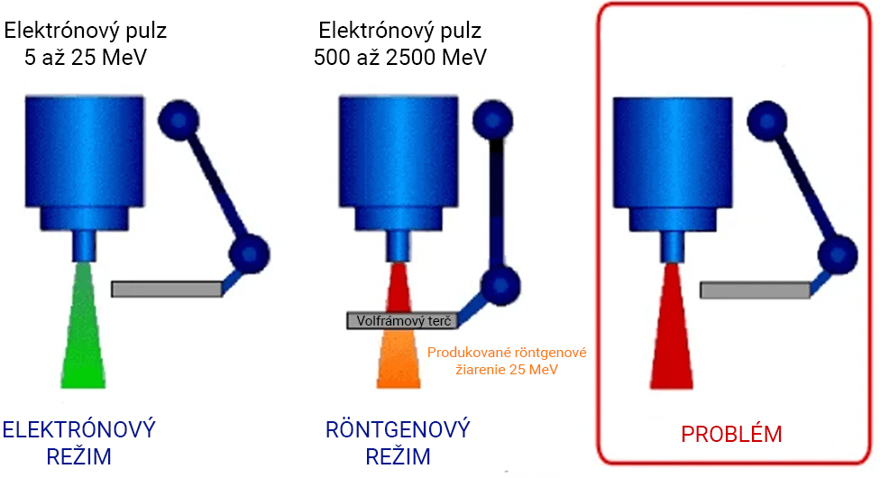 Röntgenové žiarenie sa v medicíne štandardne produkuje ostreľovaním volfrámovej platničky vysoko energetickými elektrónmi. Inak povedané, stroj ktorý zvládne vykonávať elektrónovú terapiu môže byť použitý aj na produkciu röntgenového žiarenia, ak danému lúču do cesty postavíme prekážku z volfrámu.