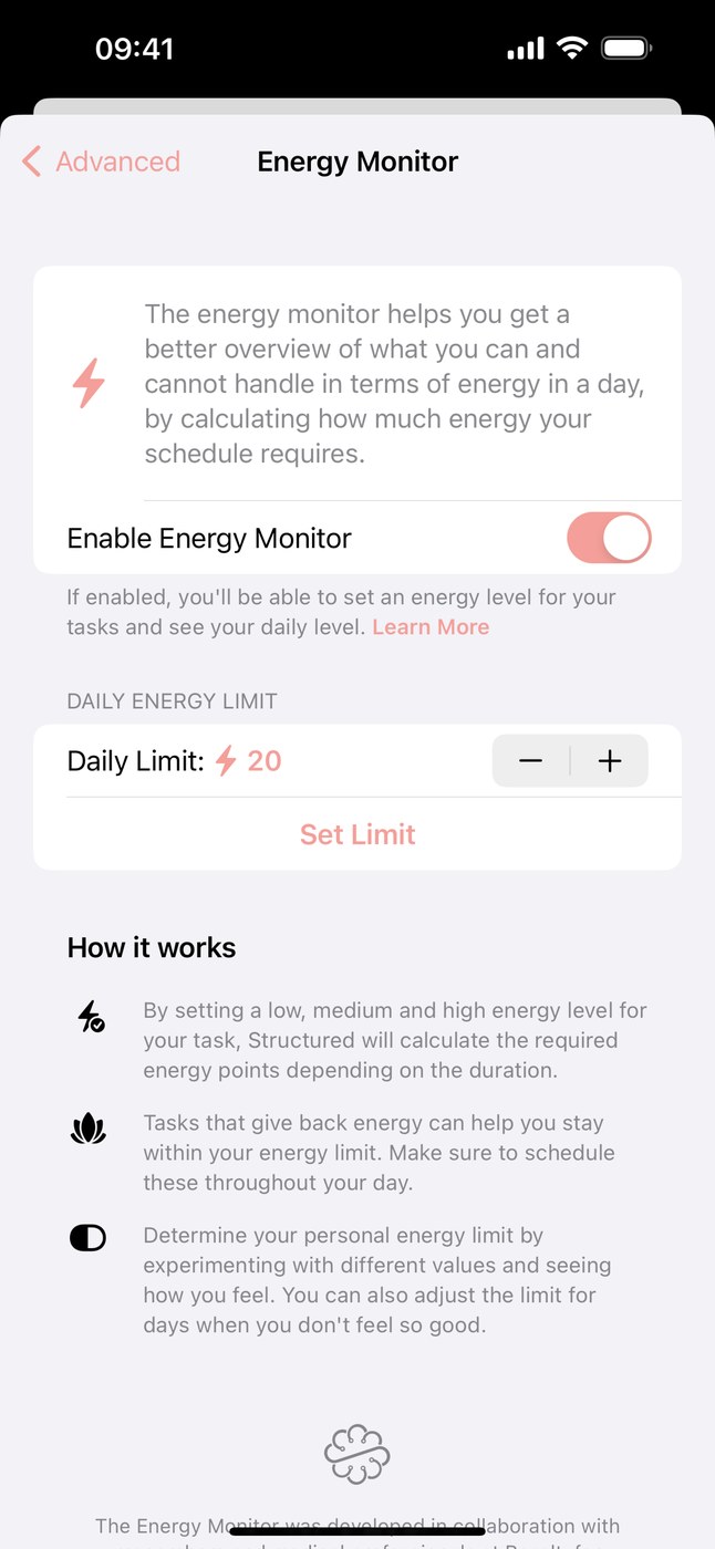Každej úlohe sa dá stanoviť dávka energie, ktorú odhadujete na jej vykonanie. Na základe toho budete vedieť, či úlohy naplánované na vybraný deň spĺňajú vaše energetické očakávania alebo sú nad limit. Je to subjektívna záležitosť, no pomáha to pri stanovovaní si priorít v konkrétnom dni. Limit energie sa dá nastaviť pre každý deň samostatne alebo používať preddefinovaný.