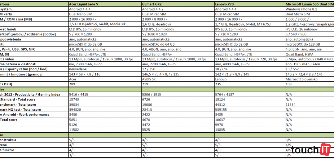 Acer Liquid Jade Sje vlajkovou loďou a najlepším modelom v portfóliu tohto výrobcu. Od konkurencie sa líši nielen vzhľadom, ale aj dosť podstatným faktom. A síce tým, že si ho môžete dovoliť kúpiť aj bežný smrteľník. Je dostatočne rýchly, má moderné funkcie, popri tom všetkom mu drvivá väčšina z nás pomalší fotoaparát odpustí. GSmart GX2 je veľmi dobrý telefón za skvelú cenu. Výrobca si dal záležať na technických parametroch ako aj softvérovej výbave. Navyše je tu 5“ Full HD displej. Celkovo ako zariadenie je naozaj použiteľné. Toto je tak trochu iný GSmart ako predchádzajúce. Lenovo P70 je vynikajúci telefón. Vyzerá skvelo a to aj s krytom na zadnú stranu a predného hrany, ktorý je bežnou súčasťou balenia. Je rýchly a má technické parametre hodné podstatne drahšieho smartfónu. Nám sa tento model veľmi páčil a toto sa Lenovu podarilo. Ocenili sme aj plánované zapnutie a vypnutie, ako aj rôzne vlastnosti aplikovateľné pri hovoroch. Microsoft Lumia 535 Dual SIM je veľmi dobrý telefón na platforme Windows Phone. Naše priaznivé hodnotenie ovplyvnila cena a tiež technická výbava v tejto hladine. Konečne je tu Lumia za vynikajúcu cenu, ktorá sa svojím vyhotovením zbavila prívlastku „tučnučká“. Microsoft ide konkurencii po krku.