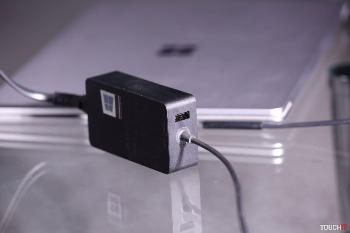 Na nabíjanie notebooku môžete využiť priloženú 65 W nabíjačku s magnetickým Surface konektorom, podporované je tiež nabíjanie cez USB-C. Už v minulosti som pri testovaní Surface zariadení chválil USB port, ktorý je zabudovaný priamo v napájacom adaptéri od Microsoftu a môžete ho využiť na nabíjanie príslušenstva. USB port má výkon 5 W, takže na nabíjanie smartfónov by som ho neodporúčal, resp. iba cez noc.