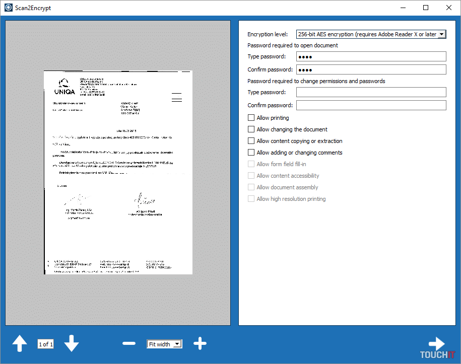 Scan2Encrypt 3.31 podporuje automatické prevedenie obrázkového textu do rozpoznateľného textu a zároveň umožňuje šifrovanie dokumentu. To v dvoch stupňoch – na otvorenie a úpravy. Heslo na otvorenie môže byť odlišné od toho na úpravy a používateľ si sám zvolí, aké typy úprav chce heslom ochrániť. Môžete povoliť tlač no zakážete kopírovanie textu v dokumente.