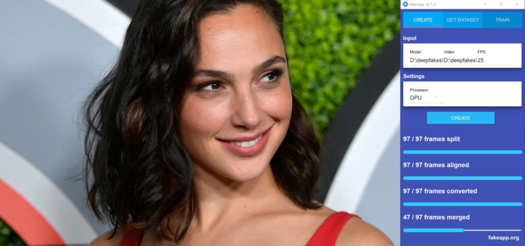 Častým cieľom aplikácie FakeApp (rozhranie vpravo) je herečka Gal Gadot