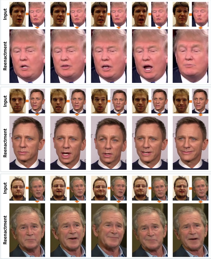 V rámci nej boli použité YouTube videozáznamy rôznych známych osôb, ako napríklad politikov a hercov, ktorých mimika bola alterovaná v reálnom čase na základe pohybov osoby, sediacou pred štandardnou webkamerou. V demonštračnom videu môžeme vidieť napríklad Georga Busha, Baracka Obamu, Donalda Trumpa či Vladimíra Putina, pričom ich mimika a pohyb úst sa zrkadlí podľa mimiky vzorovej osoby, akoby šlo o šikovného bábkara, ťahajúceho za nitky.