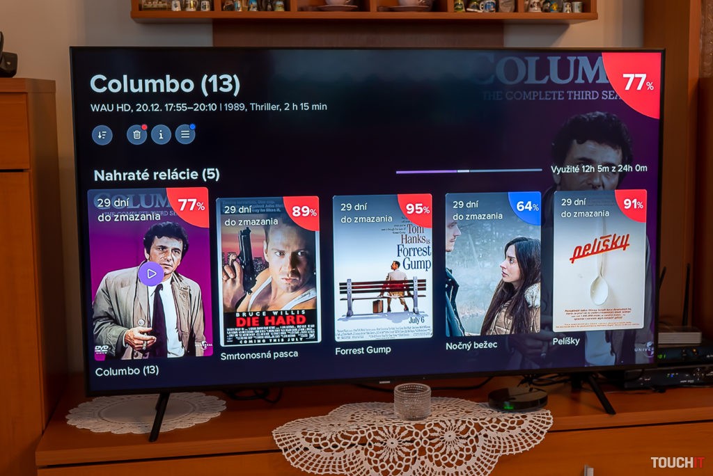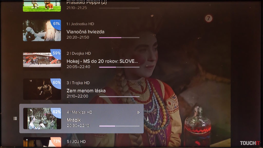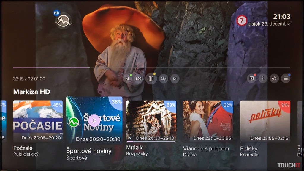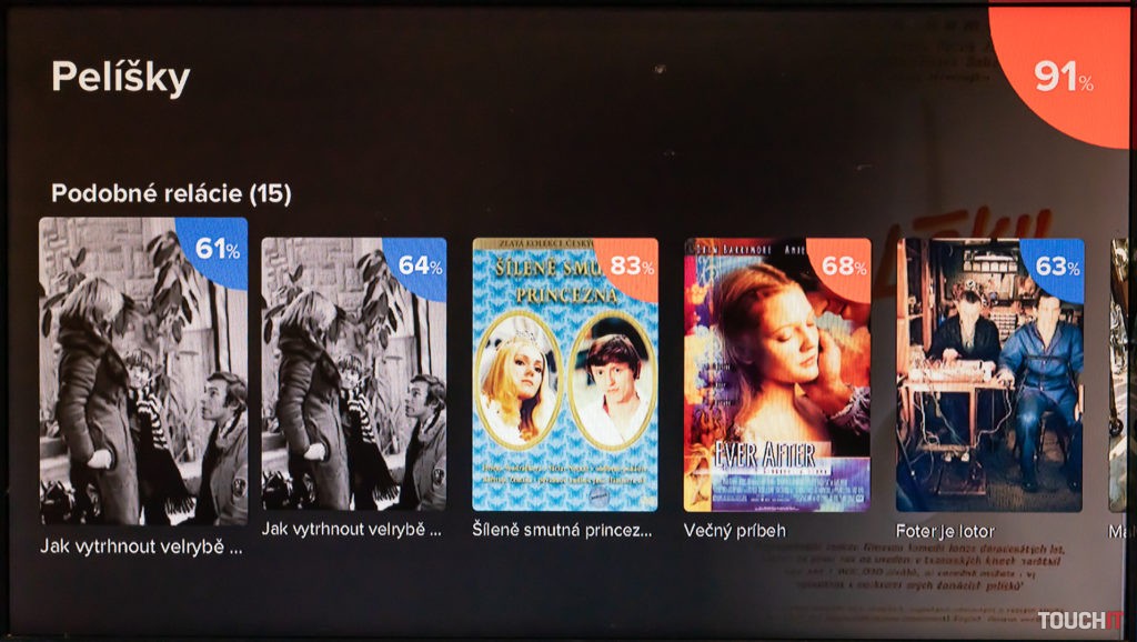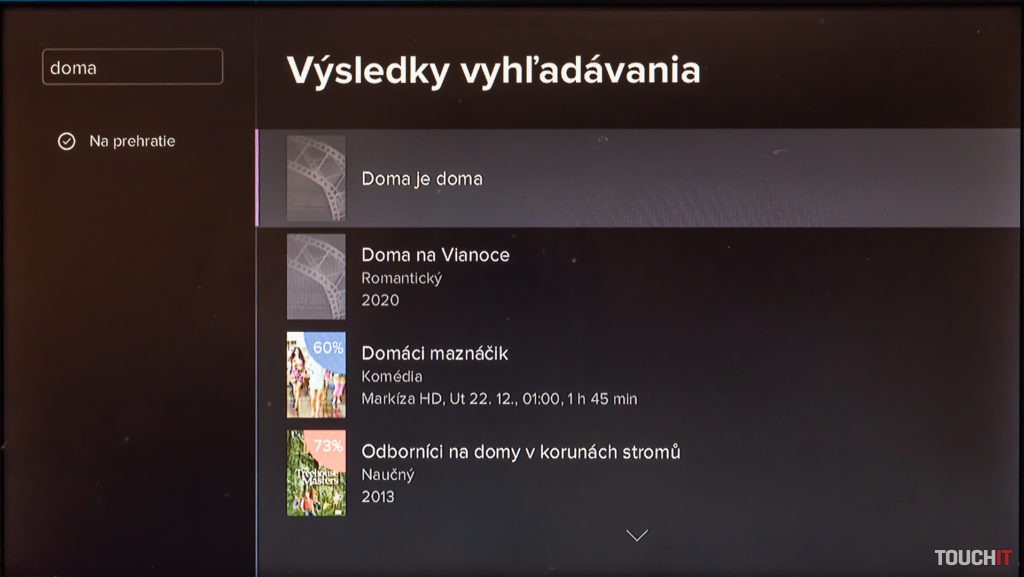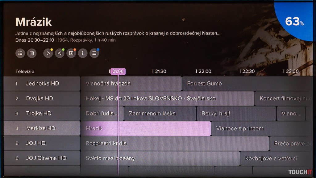 Hneď po úspešnom zadaní kľúča môžete sledovať televíziu. Prepínanie programov je okamžité, kvalita obrazu na 4K televízore bola v poriadku. Pri sledovaní aktuálneho programu máte v spodnej časti informáciu o tom, čo bude na tomto kanáli nasledovať. Rovnako si môžete nechať zobraziť podobný žáner ako je ten, ktorý práve sledujete. Každá sledovaná relácia je pritom hodnotená percentuálne, ak takéto pre ňu hodnotenie existuje. Testovali sme počas Vianoc, prakticky všetky relácie boli reprízované, a teda mali aj svoje hodnotenie.