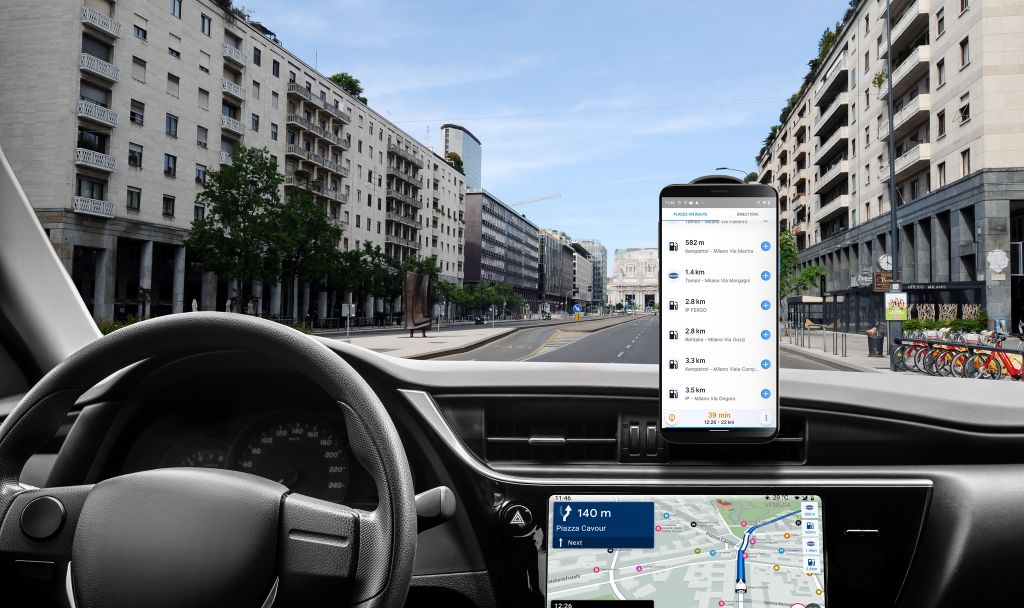 Spolujazdci môžu prostredníctvom pripojeného telefónu pridávať nové body záujmu na aktuálnej trase, zatiaľ čo navigácia beží na obrazovke auta.
