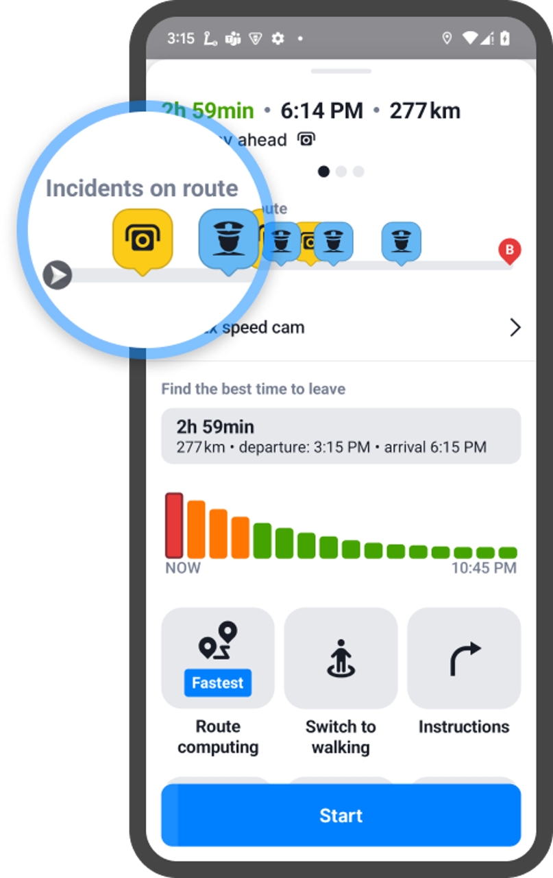 Sygic vylepšil spôsob zobrazovania udalostí na trase, ktorý poskytuje ľahko čitateľné informácie o meškaniach a incidentoch v reálnom čase. Pred výberom trasy teraz používatelia jasne vidia potenciálne prekážky, čo im pomáha robiť lepšie rozhodnutia.