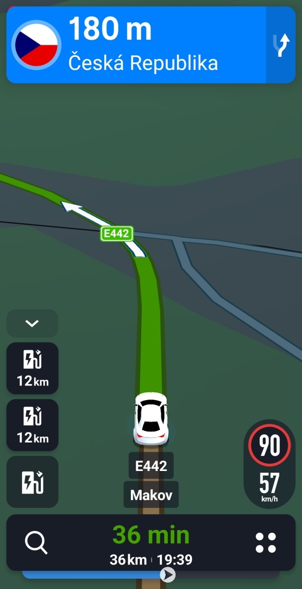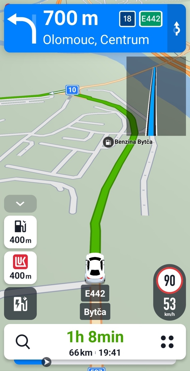 Na spodku obrazovky je informačná lišta, v ktorej pribudli čas a vzdialenosť zostávajúce do cieľa, ale aj údaj o meškaní v minútach. Os s priebehom cesty je teraz zrozumiteľnejšia vďaka modrej šípke v aktuálnej pozícii na trase. Farebne sú na nej odlíšené úseky so zdržaním, aby ste mali prehľad v reálnom čase počas jazdy.