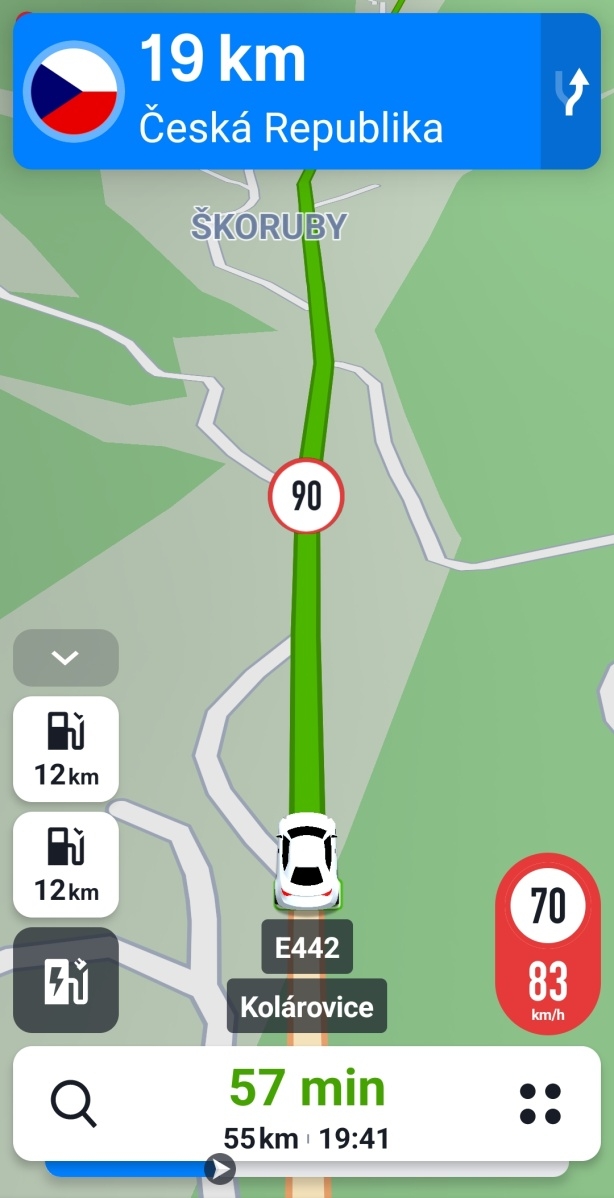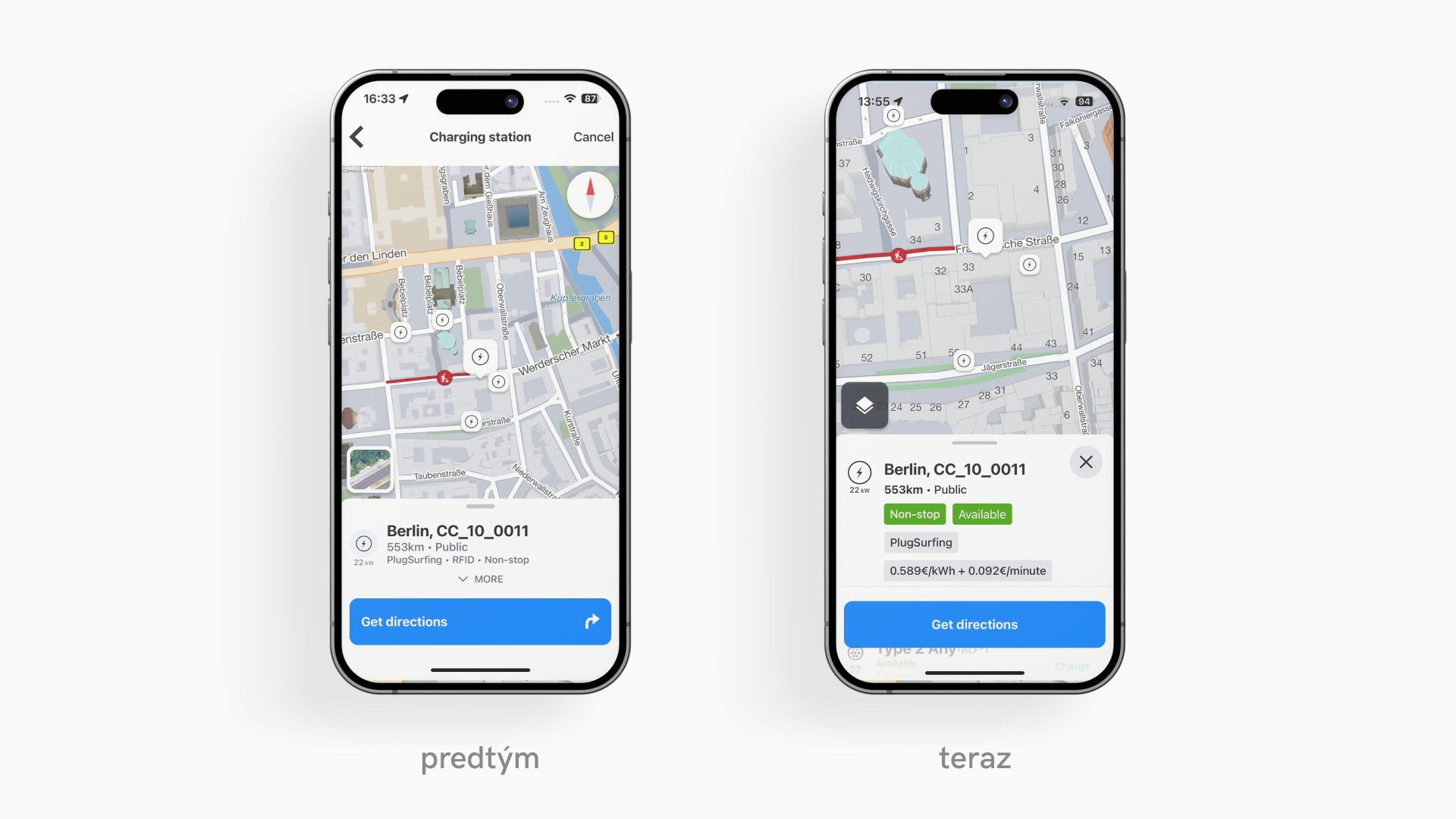 Dotyk na bod záujmu v mape otvorí panel s informáciami prehľadne usporiadanými v kontrastných farebných štítkoch. Takto jednoducho zistíte aktuálnu cenu paliva na čerpacej stanici. Pri nabíjačkách pre elektromobily sú informácie o type konektorov, platobných metódach či aktuálnej dostupnosti. Pri obchodoch či inštitúciách sú dostupné kontaktné údaje a oficiálne webové stránky.