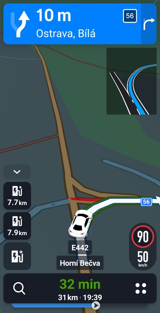 Štyri bodky v pravej časti informačnej lišty vedú na rýchle menu, v ktorom sa dá zjednodušene nastavovať trasa pridávaním alebo vyraďovaním zastávok po ceste. Táto funkcia tiež poskytuje detaily o odhadovanom čase príjazdu ku každej zastávke, aj do cieľovej destinácie. Tu sa dajú aktivovať a deaktivovať aj všetky doplnky ako režim EV, Cockpit, Head-up displej alebo Pomoc nablízku.