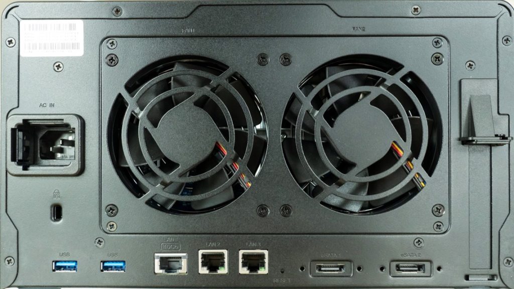 V každom prípade je dostupnosť rýchleho LAN pripojenia kľúčovou záležitosťou pre tento model NAS. 10 GbE porty tu máte hneď dva, a tak sa dajú využiť na zrýchlenie dátového prenosu v jednej sieti a nakoniec je tu ešte tretí LAN port, ten s rýchlosťou 1 GbE. K tomu sú tu dva USB 3.0 porty na zadnej strane a jeden na prednej a dva porty eSATA.