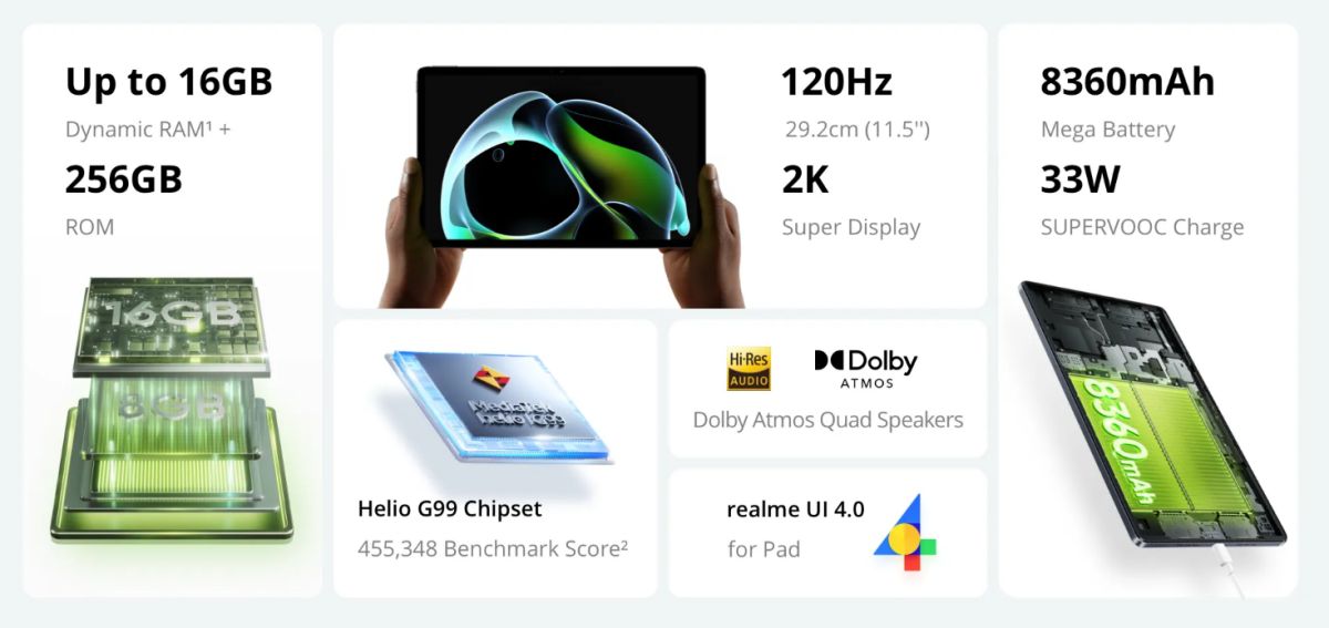 Realme Pad 2 má vo výbave štyri reproduktory s podporou Dolby Atmos, procesor Helio G99 a 6 GB, resp. 8 GB RAM typu LPDDR4X a 128 GB, resp. 256 GB úložisko. 3,5 mm jack chýba, avšak slot na microSD kartu je k dispozícii.