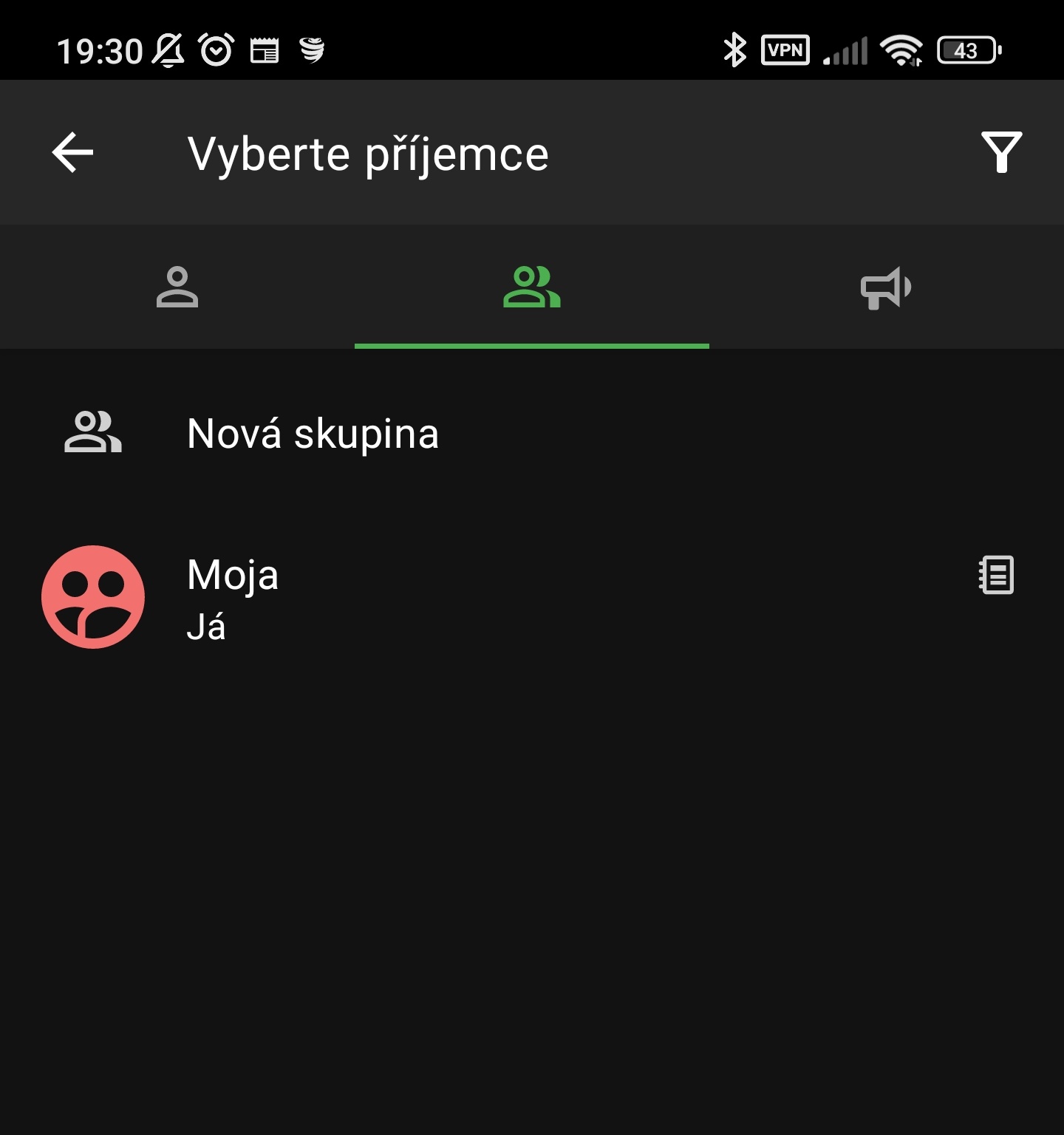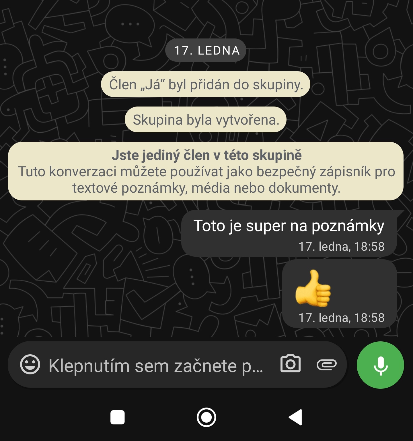 Do tejto skupiny môžete vkladať texty, obrázky aj nahrávky. Môže to byť váš súkromný diktafón. Funguje to tak, že stlačíte zelené tlačidlo na začiatok konverzácie. Namiesto kontaktu sa ale hore prepnete na skupiny a ťuknete na položku Nová skupina.